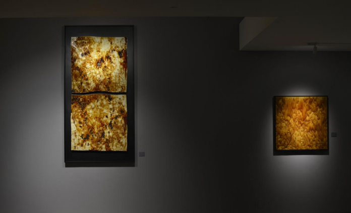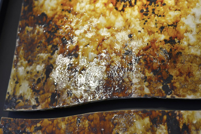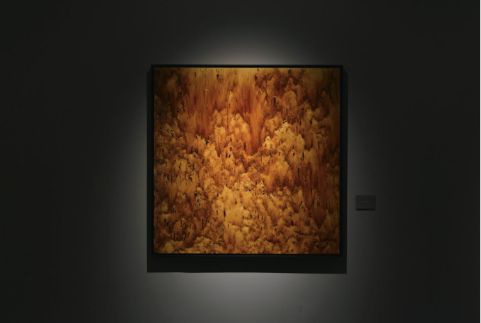 唐帝国,曾因疆域辽阔,四海宾服,而有“巨唐”之称,往事越千年,巨唐的风采,只能从遗留的文献、古物中略览,但进入颜山美术馆中,第一眼见得耀色,视觉上,恍惚便是巨唐的颜色,如此巨幅异形瓷画,黄褐三彩,流动处,如大河奔流;锈斑处,如河床嶙峋,自然地,便凝滞了空间。