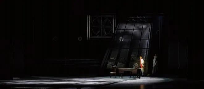 不同的颜色具有不同的色彩情感与联想,灯光设计运用不同的色彩表达不同的空间或是激发观众心理情绪。该剧中,舞台灯光在整体色调选择上,使用饱和度较低的色彩,使舞台呈现“铁灰色”的视觉效果,体现所有人物冰冷残酷的生存空间。比如第五场李剑飞办公室,当时他得知共产党高层顾顺章已经叛变,形势岌岌可危,决定连夜赶往上海向组织报信,为了确保行动成果,一双儿女必须留在家中,势必会被敌人抓捕,这对一个父亲是何等揪心的决定!灰色阴郁的舞台空间、铁黑色落地窗和投射在地面上的巨大阴影,一如他难以抉择的内心和岌岌可危的环境(图5)。