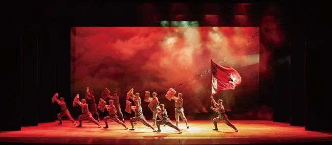 而在解放军顺利进攻的场面中,浓重的烟雾代表场面的激烈、人民的热情与胜利的热血沸腾,强烈的光速感伴随打击乐的铿锵和演员的武打动作,遒劲有力、直指人心(图10)。
