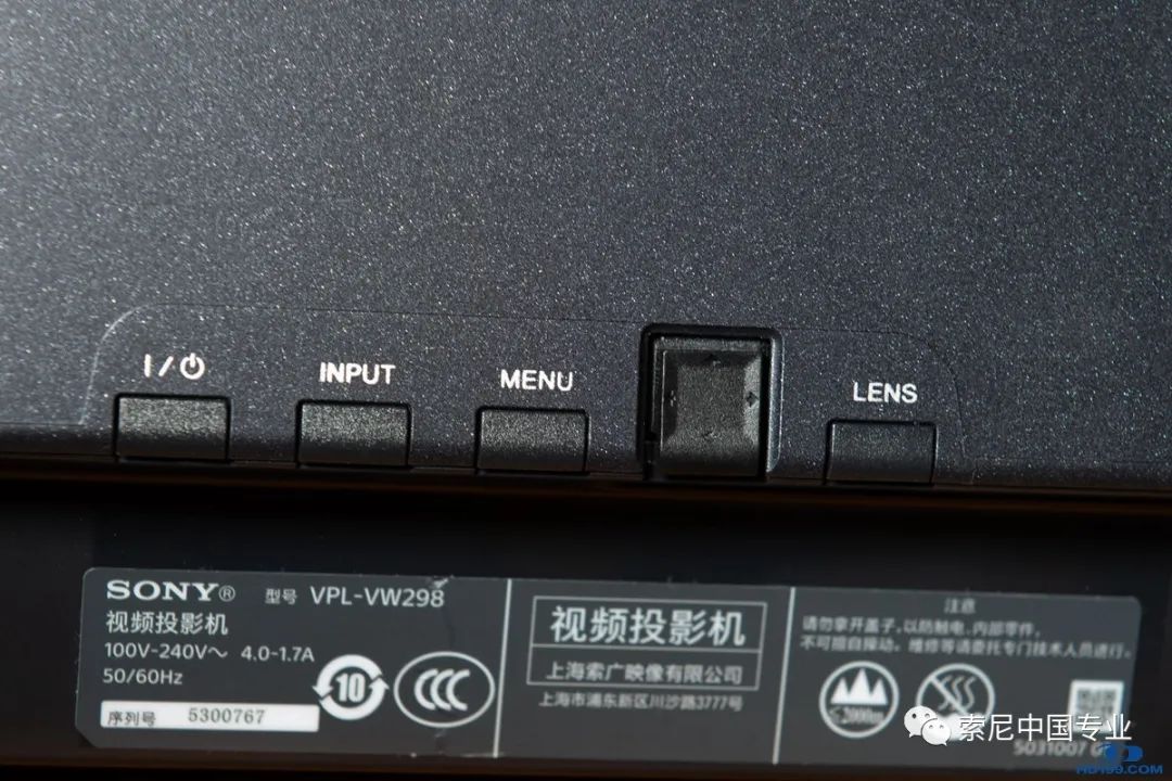 开机了,首先调整画面位置,LENS是选择焦点对焦、上下左右位移、变焦,然后用旁边的4方向键来调整。机子左侧是HDMI接口等。由于我没有说明书,不懂得面板对齐,导致到手后没有调整,所以拍出来的放大分辨率图可以看出色彩上下有溢出(当时水平业余不懂这个,后来仔细看拍摄的图,查找资料才明白)