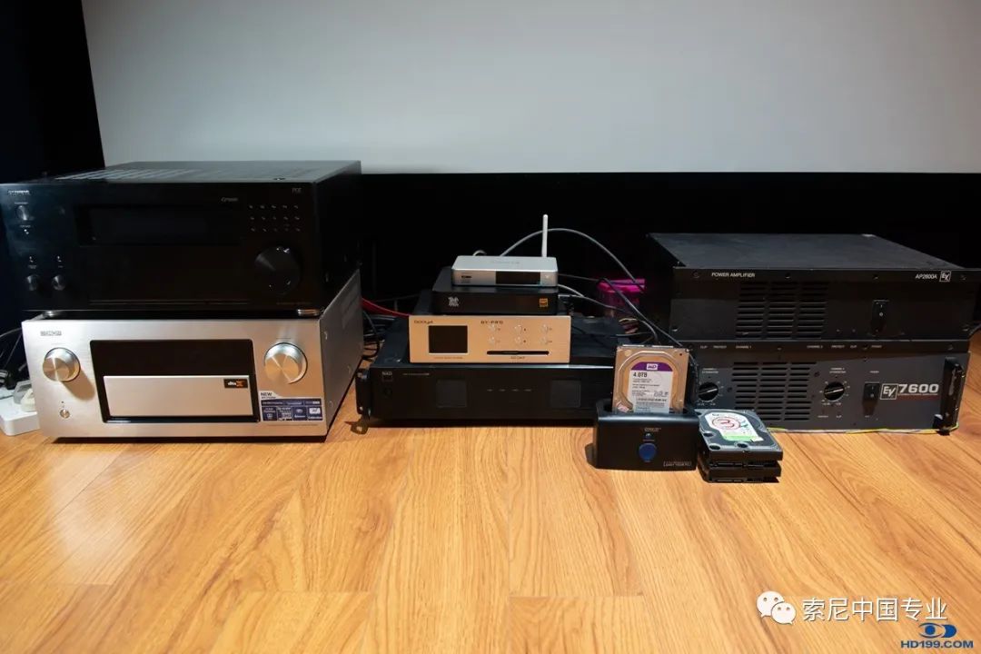 这次测试我所使用的涉及器材如图:主要有前级安桥RZ5100(下面金色的是天龙X7200WA)、播放器是魅视7702、三台EV和NAD后级、HDMI线用开博尔L系列紫线。