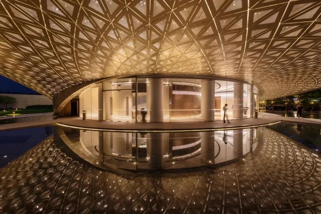 如果说折板彩釉玻璃照明系统吸引你靠近这个场所,那三角面铝板照明系统则能给你足够的惊喜和浪漫,当你漫步水景小道或园林小径,在不经意间俯仰即闯进了满眼星光。冲孔板内部有一层淡淡的灯光底色,三角冲孔板区域内则点光源泛出熠熠星光。
