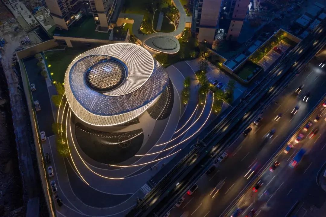 夜幕下,光与建筑碰撞,如同“核聚变”,光跟随建筑圆弧迭代变化,在夜晚光追逐建筑,追逐夜间光的无限变化,塑造夜间轻盈动感的建筑形象,为建筑添光,为景观打造光意境。