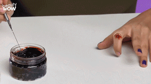先用眼影打底,再随性地涂上血浆,一个吓人的易拉罐之眼设计好了