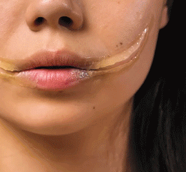 用乳胶在嘴巴两边画上长长的一道,至少要画三层打底