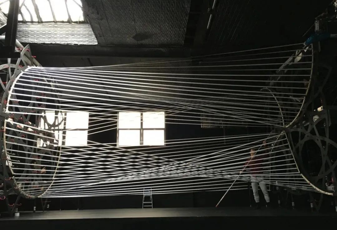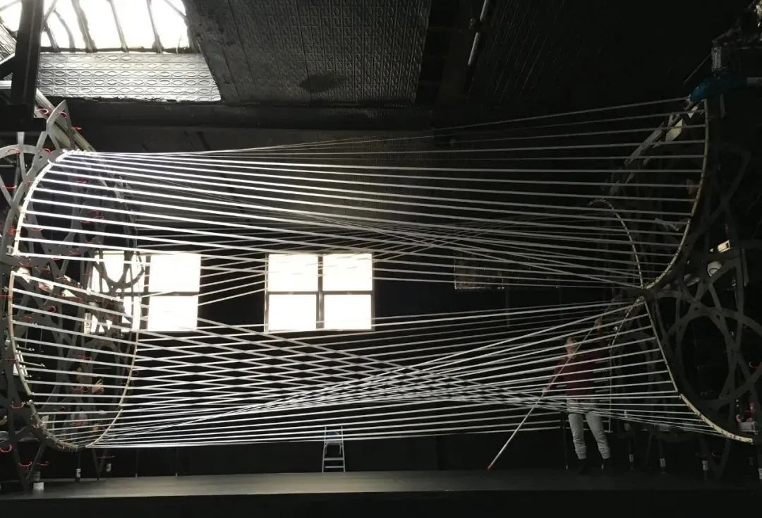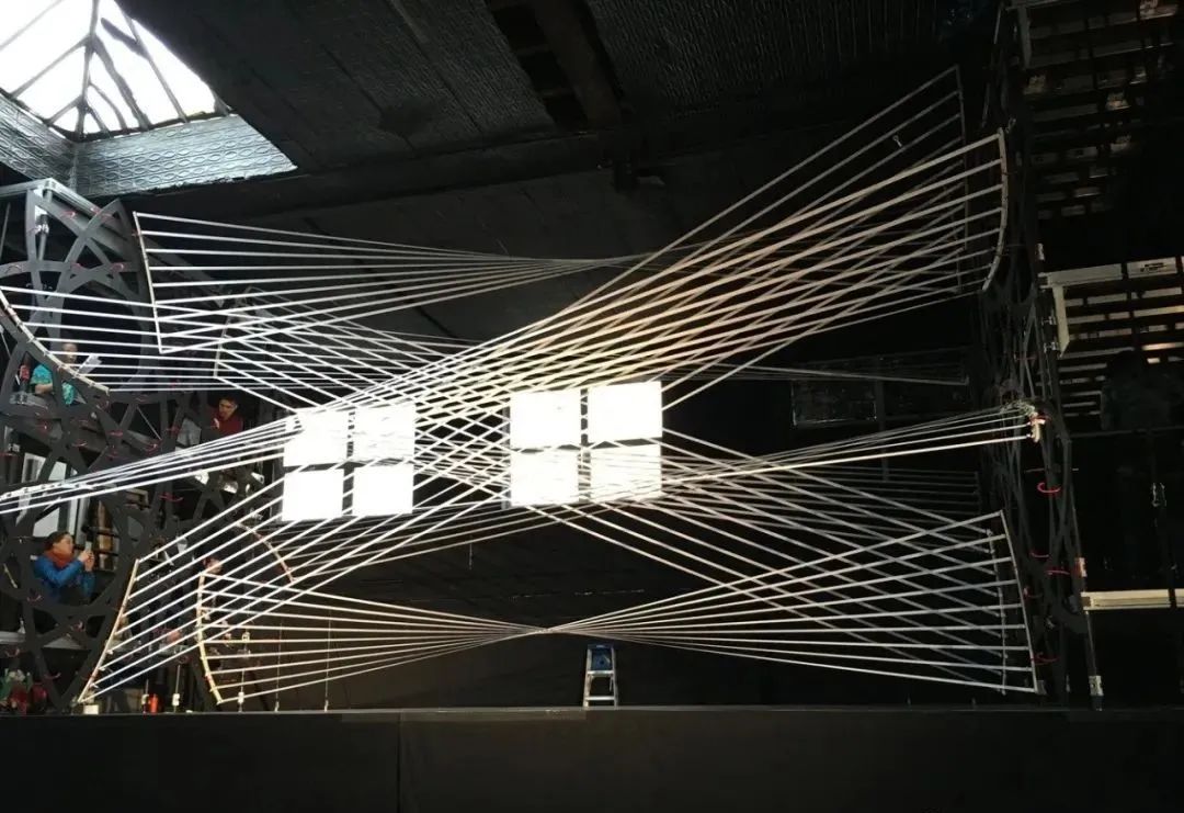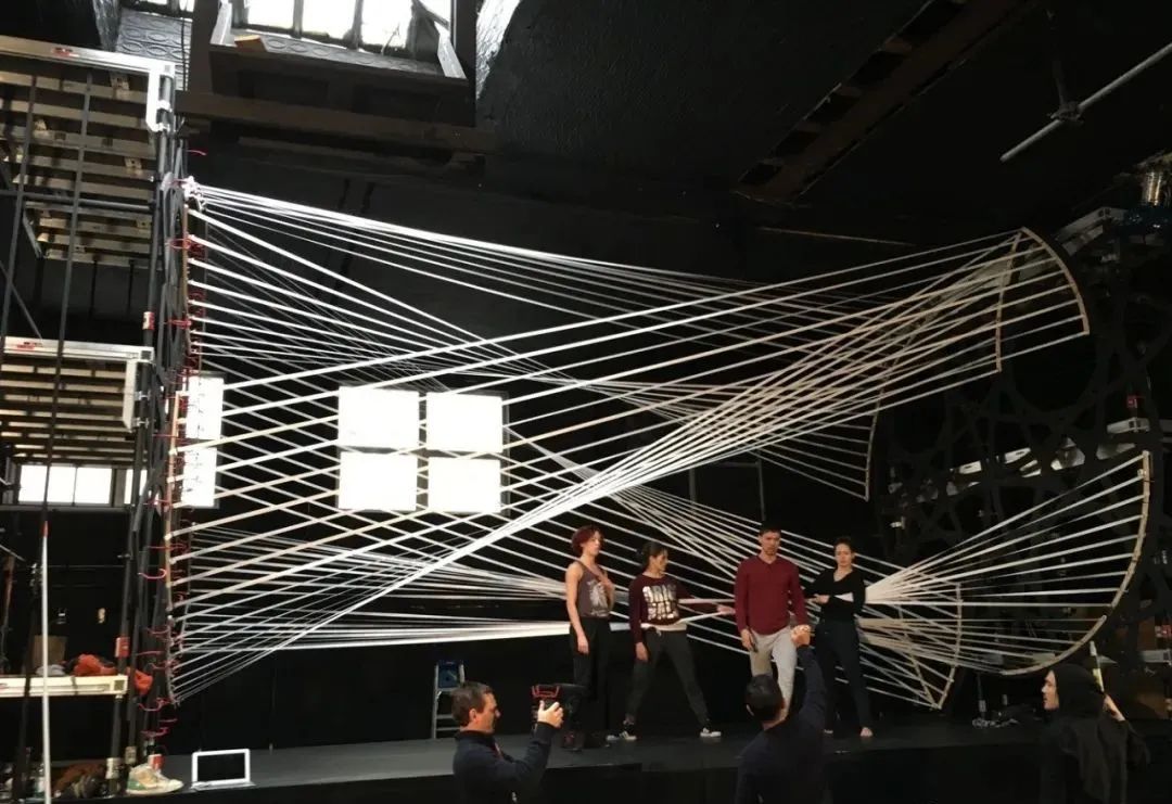 他设计了一个包括6组9根绳子连接到舞台下的两个支架的系统。这些绳子就好像乐器上的弦,弦的运动需要简单和干净,但又能复杂。Gabriel Calatrava(加布里埃尔·卡拉特拉瓦)考虑过使用马达来拉伸和放松弦的旋转。但这显然变得太贵了。相反,他认为舞者可以移动舞台上的这些绳子,即琴弦,而且比机器更优雅。因此,通过舞者的动作,舞台上的绳子交叉、拉伸和压缩,从而形成的一系列的变化式舞台布景结构,同时为观众创造出对舞台上演奏的音乐的新认知。