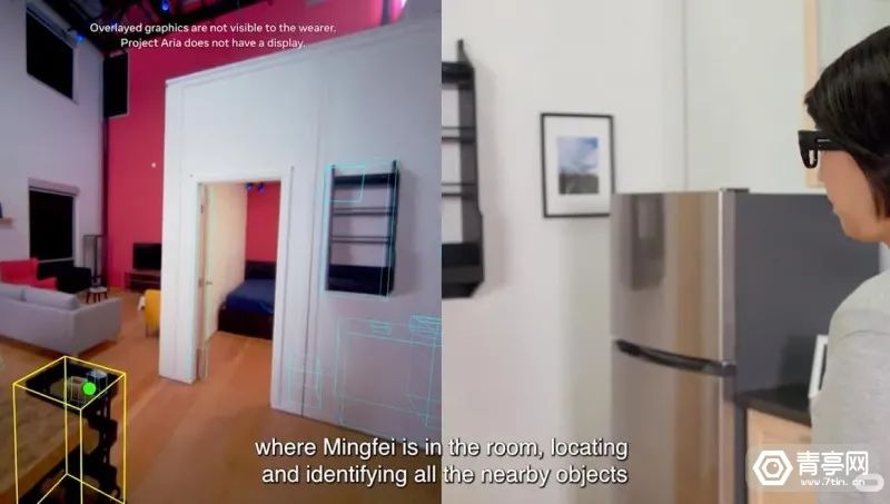 Meta展示了Project Aria进展,包括3D环境映射以及情景化AI能力。不仅可以感知环境中的物体,还可以预测这些物体都能做些什么,有什么功能,例如台灯可以转动,电视机可以开关机。