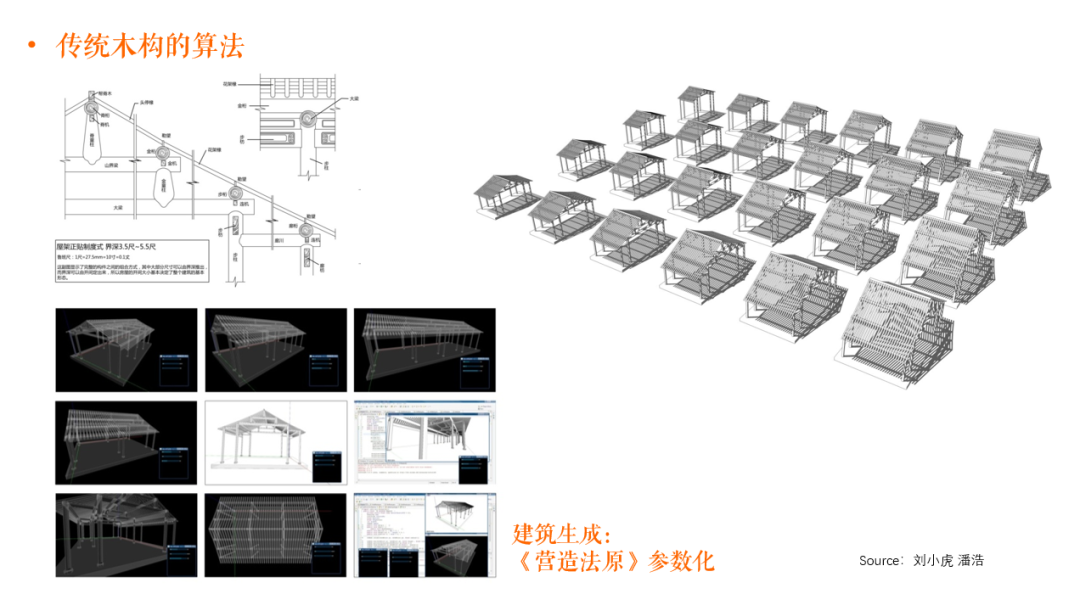 匠作之美部分以《营造法式》开篇,引出中国古代木构建筑中的数术文化。说到祈年殿内部结构对规矩方圆的控制:“这种经典的尺度比例关系,才造就了这样一个经典的建筑。”又说到应县佛宫寺释迦塔:“世界上现存唯一最古老的、最高大的木构建筑,矗立千年不倒,还能够如此的经典、漂亮…从它的剖面图表达中可以看出里面的精妙之处和细致工作的体现”。在分享中,谭教授分别展示了陈明达先生在工程技术的角度对应县木塔的结构分析和傅熹年先生在环境氛围的角度对建筑礼佛空间视线的分析。“为什么中国建筑会有第五立面?和我们的视线一定是密切关联的。不管是传统手工的测绘还是现代数字化技术的运用,我们可以来做一个解读,探索木构的形式比例、结构和尺度的规律。这也是今天机器学习的基本逻辑”。“从屋身到斗拱到屋架、屋顶等等,中国传统的建造其实是一种装配式施工,如果不是模数化,不是所制定的一些标准,建筑能够装配的到位吗?” 模数系统的建立,不但在一座建筑内部产生了和谐的比例关系,而且还被用来统领和协调建筑群的秩序。