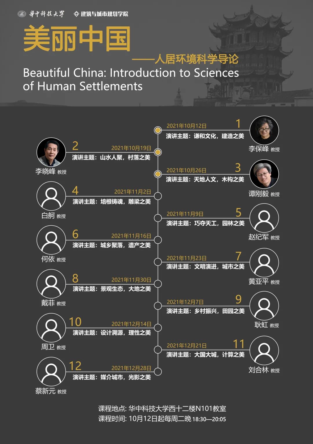 课程 美丽中国——人居环境科学导论 课程简介 华中科技大学建筑与城市规划学院精心打造的课程思政精品《美丽中国——人居环境科学导论》课程于2021年10月开讲。课程共分为12期,采用系列讲座的形式进行,邀请12位资深教授,围绕国家战略需求,从人居环境角度向大一新生讲述中国“悠久的建筑历史,独特的建筑体系,巨大的建设成就,丰富的文化遗产,振兴的美丽乡村,秀美的大好河山,持续的生态保护,创意的光影艺术”等主题,全面展示中国的“建筑之美、城市之美、生态之美、文化之美”。 通过学科导论课,围绕课程思政建设,解读设计改变生活,设计对人类的贡献,设计师的家国情怀,宣扬我国优秀传统文化和巨大建设成就的同时,也提出未来的机遇与挑战,志在培养同学们对专业的热爱与责任担当。该课程入选学校课程思政示范项目,立项建设以来得到了本科生院的大力支持和指导。 授课地点为华中科技大学西十二教学楼N101教室,欢迎所有对建筑、城市、景观、设计感兴趣的同学参与学习交流。