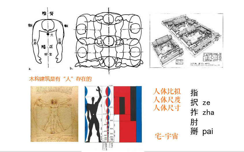 谭刚毅教授在这部分提到,木构建筑中是有“人”存在的,人体的比例、尺度、尺寸在木构建筑中均有体现。而中国木构建筑中关于人的关系和西方模数化的人体尺度是不一样的。“中国最古老的住宅建筑有着最基本的空间格局,就是一堂二内,一个堂屋两个房间。也就是说在这个原始住宅的诞生之初它就开始有了一些等级空间和最基本的人的位置关系的划分。以致于影响了我们千百年来的这种以中为大,尊卑有序的这样一个空间格局”。“在群体组合建筑中最能体现空间仪礼的建筑群当属故宫,其中体现着是一种关于人的思考,在这里空间的布置都是有着一种仪礼在的,这种建筑空间的营造还有着审美上的节奏感,这样的一种序列关系:序曲—渐进—高潮—结尾”。“我们也可以看得到,无论是故宫这么大体量的建筑群还是佛寺或是道观,它们都是这种围合式的合院格局,我们中国的建筑特别是民居建筑,你会发现全国各地有着各种各样的合院,这种空间上的组合就形成了非常丰富的艺术建筑类型。同样的,我们也可以看到,古代建筑都有着共通的标准的配置方式,一句话概括就是通用式设计。通用式设计并不是没有特点,反而它会变得非常具有适应性,这是中国人的另外一种智慧”。