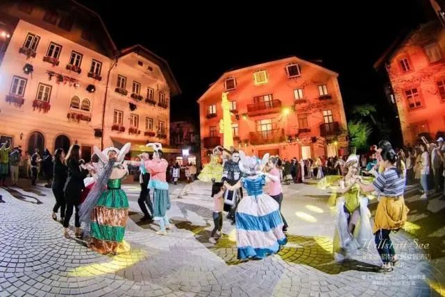 剧情、场景、灯光等因素自然是沉浸式戏剧中必不可少的部分,这也是大多数新兴的沉浸式戏剧的必备内容。而在这场以整个小镇为载体的大秀中,夜游开幕时的《寻梦爱丽丝》3D Mapping沉浸式演艺特别抓人眼球,引起游客阵阵欢呼。
