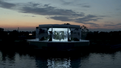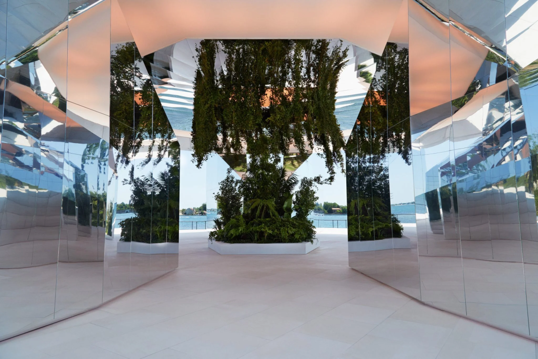 古希腊神庙般的结构和体量、炫目而剔透的反光内饰以及攀援而上的绿植,镜面空间映射着周遭一切的景观及其随着时间和光影的流变,未来主义和自然主义在此交融。