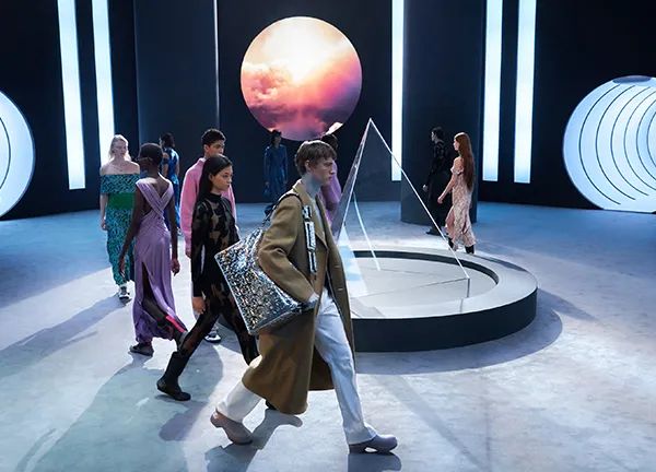 霓虹灯闪烁在跑道和穹顶上,配合玻璃灯光不断反射,为时装秀增添了梦幻般的神秘感。