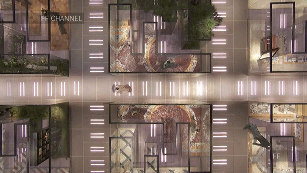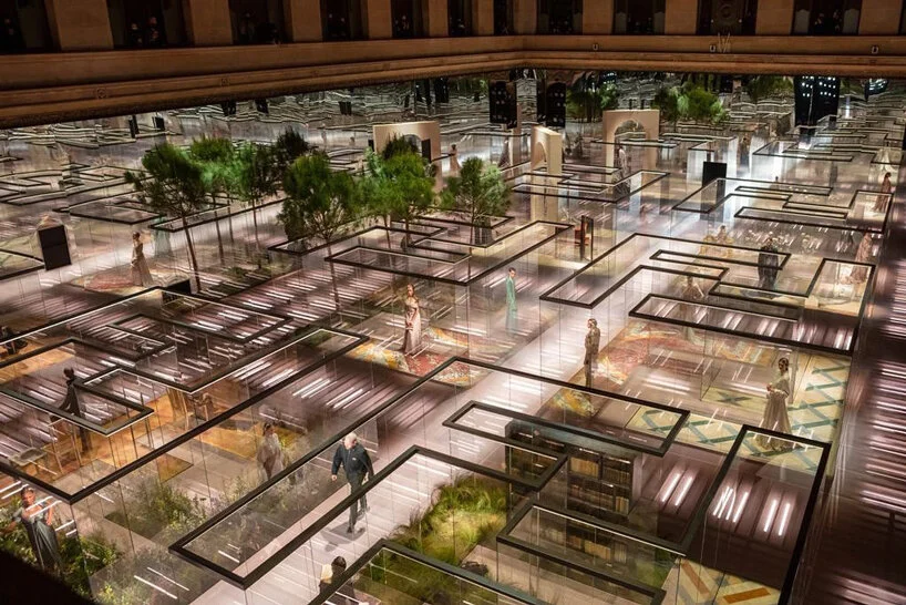 模特们穿梭在这个迷宫之中,在由玻璃空间中点缀有绿植和品牌珍贵物件展示,营造出整体温暖的氛围。