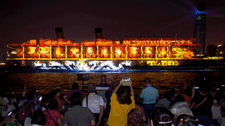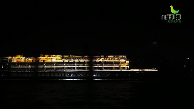 武汉旅游新地标“知音号”,驶离码头,置身波涛中成为江上漂移的“光影之舟”。在码头上巨型投影设备投射下,120米长、19米高的船身成为五彩缤纷的荧幕。黄鹤楼、江汉关、长江大桥等元素融入演出,大武汉的发展和文化在光影中一一呈现。