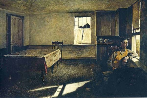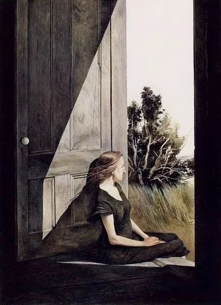 怀斯的画里就很少有熙熙攘攘的喧嚣。他的画里有很少有很多人。有人的画,基本上是一名老人,或是一名妇女在屋子里、阁楼上或阳台前、旷野上静静地坐着或卧着,女孩青春期怅惘地默立或静静沉思。他以敏锐的感触,精致的写实技巧,捕捉视觉的一瞬。怀斯创造一种属于个人的主观艺术,以一种连续而持久的个人主义,应付这个毫不稳定和全无把握的现实生活。