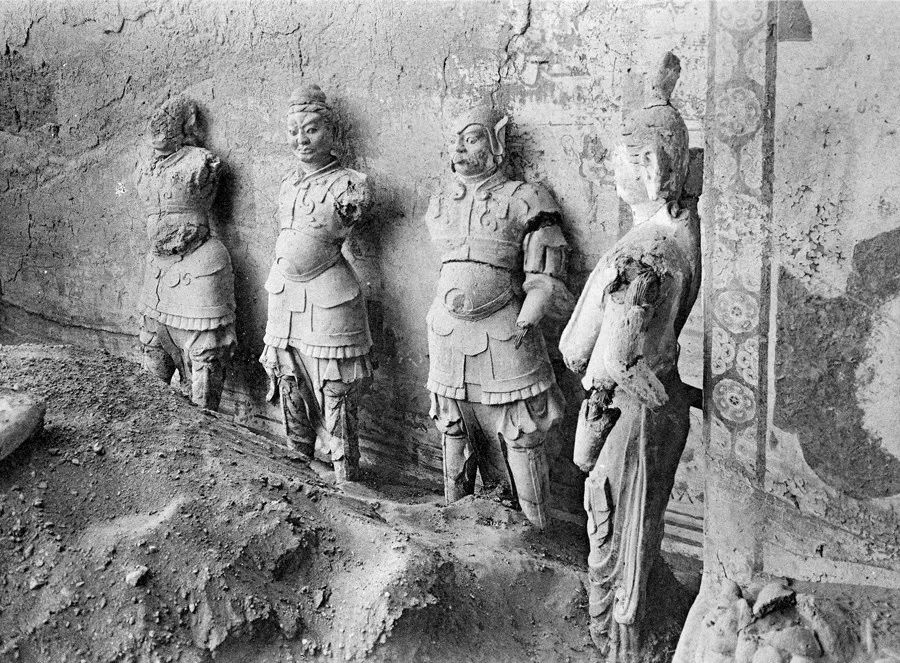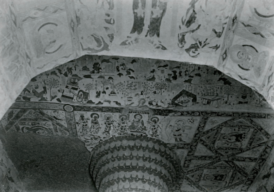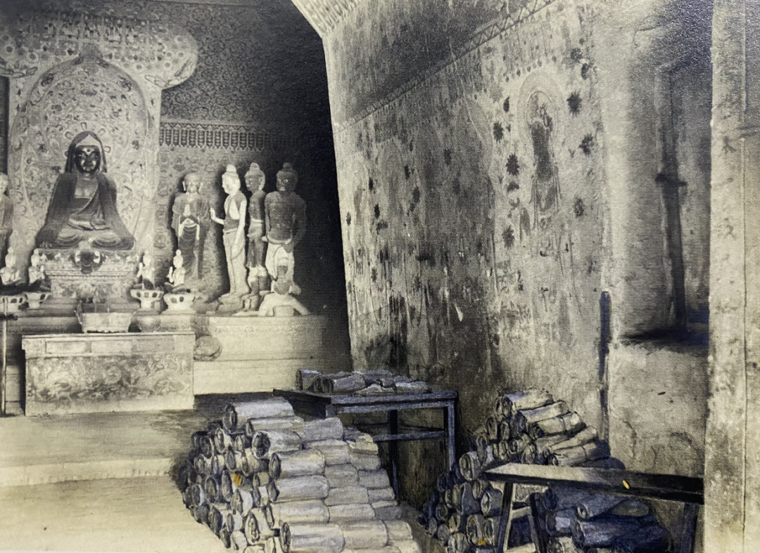 ▲莫高窟第十六窟,斯坦因摄,经卷为后期手工添画。图/《世纪敦煌》