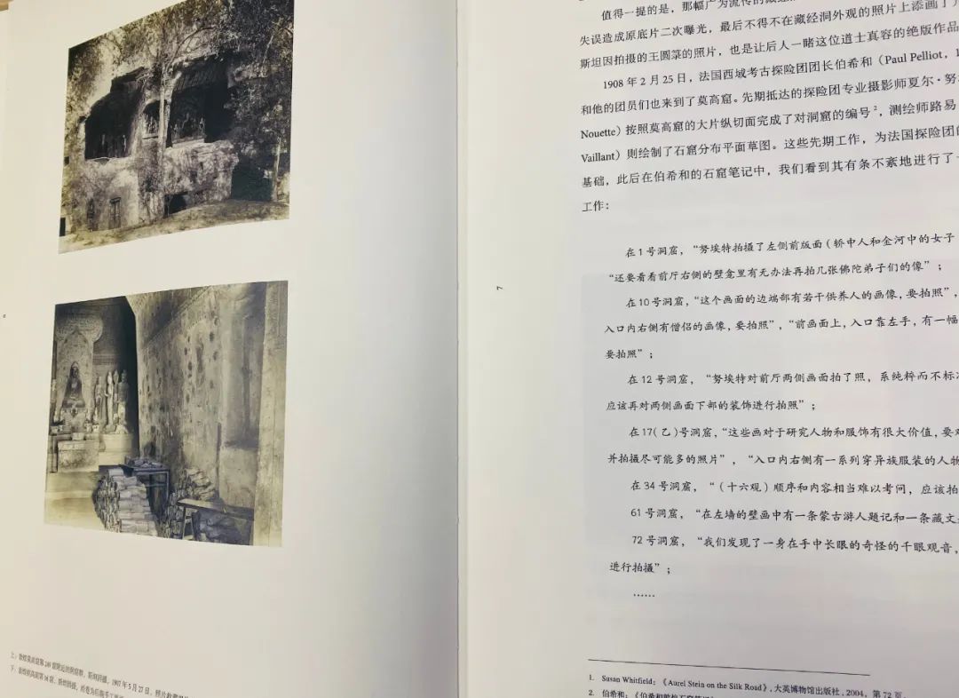 14载春秋,精准模拟1908年文物摄影角度、景别、光照。▲莫高窟158窟,左侧吐蕃赞普头像已残。图/《世纪敦煌》将120年前的旧照与现在进行对比,再现莫高窟的前世今生。“看莫高窟,不是看死了一千年的标本,而是看活了一千年的生命。”121年前,道士王圆箓无意中敲开了藏经洞,敦煌就此重现人间。1944年,国立敦煌艺术研究所才成立。在这之前几十年里,莫高窟完全无人管理,来去自由。▲清政府于光绪三十一年(1905)发给伯希和的护照。图/《世纪敦煌》1908年伯希和探险团有计划地来到敦煌拍摄,几乎抓住了莫高窟中最有价值的部分:“我认为,无论从拍摄照片还是语言角度来讲,我们都从千佛洞中得到了希望的一切。”▲1908年,伯希和在藏经洞里挑选经卷。图/《世纪敦煌》回国后,伯希和花了10年时间,出版了第一本莫高窟的大型图录,影响力至今不可小觑。最不可弥补的是,美国人华尔纳花5天时间,用事先准备好的胶带,粘走了大小不等的12块壁画。▲323窟 主室南壁(初唐)上图:孙志军 摄 下图:历史影像。壁画中间缺失的部分,于 1924 年被美国人华尔纳盗劫破坏。图/《世纪敦煌》华尔纳盗窃的323窟南壁金像部分,现存美国哈佛艺术博物馆↓美国人罗寄梅,在1943年至1944年期间,拍摄了2000多张照片,全部带回,卖给了普林斯顿大学。以上种种带来的资料欠缺,莫高窟经历了怎样的历史巨变,很难得到完整的认识。近十多年来,孙志军走访了全球多个国家的博物馆和研究机构。收集数千张斯坦因、伯希和等人拍摄的早期的敦煌影像,跨度近半个世纪。以编年的方式梳理,参考引用了大量史料文献,带我们回顾了1907—1949年那段晦暗而矛盾的历史。相较于美学价值,《世纪敦煌》这本书的史实意义更重要。