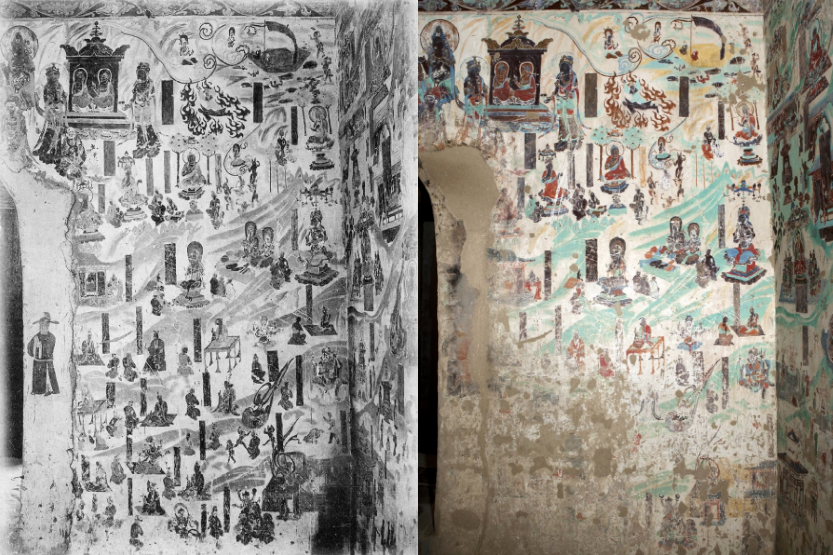 ▲莫高窟第46窟,主室南壁 上图孙志军摄 下图1908年旧照。图/《世纪敦煌》