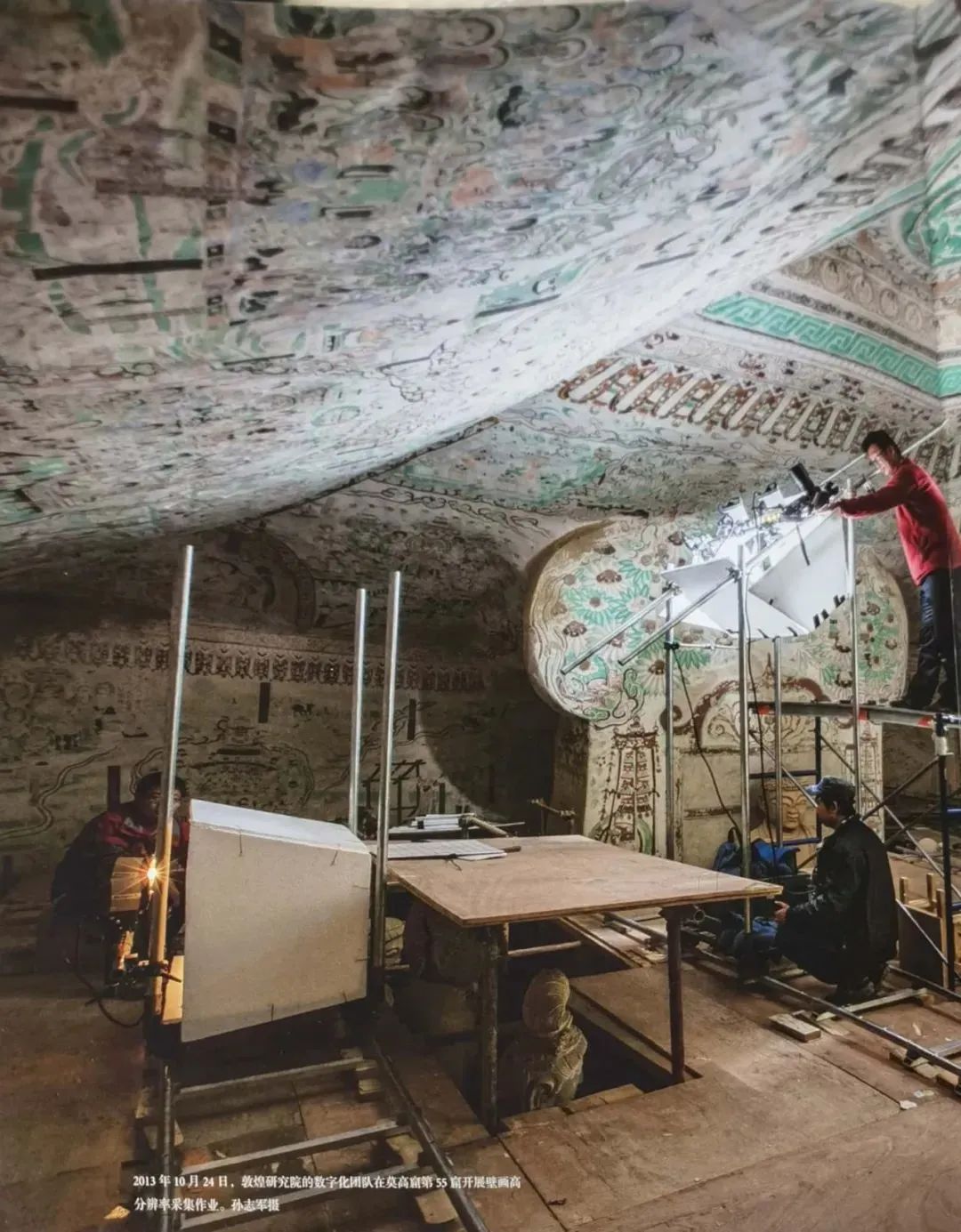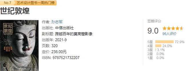 用独特的古今影像比对形式呈现,直接看到洞窟内外的今昔差异。▲莫高窟第459窟,原有天王立像三身及菩萨一身,均佚失无存。图/《世纪敦煌》看到1908年由法国人伯希和拍摄的洞窟图片时,才发现莫高窟的彩塑、壁画等文物,仅仅和百年前相比,就已经大大退化,或模糊,或丢失......▲302窟 窟顶西披(隋)上图:孙志军 摄 下图:法国西域考古队 摄(1908年)。图/《世纪敦煌》掉落的每一块岩石、缺少的每一个部件,都在诉说莫高窟经历的各种雨雪风霜。▲莫高窟第217窟 墙壁下部及门南沿在1908年后遭毁损,颜料层脱落严重。图/《世纪敦煌》每幅图配有简洁的文字,浅显易懂地讲述照片里的故事和艺术。石窟的绘画、衣饰纹样、塑像......更系统的与王朝更迭产生呼应共鸣。在专业文物摄影师的镜头下,我们得以跳出常规游客视角,让莫高窟的前世今生,直观呈现。《世纪敦煌》中300多页高清历史影像,每一张都值得用放大镜仔细鉴赏。莫高窟,七百洞窟,三千彩塑,四万多平方千米的绘画。45号窟观世音菩萨像,盛唐时期敦煌雕塑中最完美的作品之一。这些塑像,有三十多米高的巨像,也有十几厘米的小像。张大千曾说:“如果你想成为画家,一定要去一次敦煌。”除了熟悉的飞天神佛,壁画中还描绘了大量历史人物,既有真人真事,也有想象虚构。第9窟的白描佳作,此画目的也许是为武则天称帝制造舆论↓壁画中的人儿,步动则摇的簪钗,高耸逾尺的发髻。还要点缀六支银钗,不敢想象有多沉。▲曹延禄姬供养像 莫高窟第61窟 孙志军 摄 图/《世纪敦煌》这些现实生活的描摹,也展示了壁画艺术的人情味和烟火气。书本纸张也经多次对比试验,才最终决定采用120g哑粉纸及四色印刷工艺,还原真实的壁画色彩。不同历史时期塑像结构、壁画肌理、绘画技法、时代特征......忠实地表达古人的情绪,直接用影像让我们和古人对话。▲莫高窟217窟,盛唐画观音菩萨像。图/《世纪敦煌》“我无法对抗时间的流逝,无法阻止自然对莫高窟的摧残,唯有用影像的力量,来记录敦煌。”——孙志军2007,莫高窟重摄之旅开始启动,直至2011年才基本完成。▲ 146窟-窟顶藻井, 孙志军 摄。图/《世纪敦煌》将20世纪的相关照片整理出来,选取同样对象,从同样的角度、在同样的季节甚至同样的光照条件下进行拍摄。为了保护和延长文物寿命,拍摄过程中需要尽量降低人为因素的介入。 ▲敦煌研究院数字化团队在莫高窟第55窟开展壁画高分辨率采集作业,孙志军摄。图/《世纪敦煌》正是有这么多人的坚守,用脚步丈量敦煌,用镜头定格敦煌,才铸成了这本《世纪敦煌》。那些优美壁画,在风沙与盐碱侵蚀下,慢慢剥蚀当年的旖旎。或许有一天莫高窟会消失在漫天的沙尘中,但书中留下的影像会永远铭记这个古老而悠长的艺术宝库......