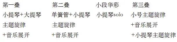接下来,在“痛苦中的温情”中,节奏开始“比较自由”甚至“几乎无节拍”(第255~277小节)。之后一句中,交错地采用延留音,加上节拍的自由,音乐听起来让人感受到悲伤至极的窒息。随后,小提琴solo出现了一段加速的华彩乐段,使得音乐得以再次振作起来,向下发展。随之,木管组单簧管略带低回,如洞箫般地奏响琴歌《阳关》的主题旋律(第290~302小节)。同时,小提琴也重拾起那段熟悉的旋律(第302~311小节)。之后,小提琴solo在主题动机的基础上,音乐进行不断展开、变化,十六分音符三连音的节奏型再次出现,持续处于离调状态。从第430小节开始,音乐迎来第二次高潮,木管组、铜管组、打击乐组均开始使用十六分音符三连音的进行,一直到487小节,音乐一直处于疯狂的状态(Madly),小提琴solo充满活力,与乐队竞奏。直到小号奏出主题旋律,如拨开云雾,明亮的铜管音色将音乐带入第三部分(第三叠)(第491~497小节小号主题旋律)。小号两处装饰性的滑音,既有古风,又彰显出现代音乐的音色特征,是古代遗音还是现代爵士风,似乎每个听众的感受都有所不同。似乎是小号的主题旋律没有“讲”完,木管组的双簧管为其续写了乐句,在相同的调性上,音色则不同,高远而飘渺(第497~500小节双簧管旋律)。小提琴solo接着在主题旋律的基础上,对主题动机进行变奏式的发展,一字一音式,如吟诵诗歌一般(第500~513小节)。直到第530小节,小提琴solo又完整地奏出主题旋律(第530~553小节)。在渐渐远去的彩色记忆中,音乐渐行渐远,最终消失在耳畔。纵观全曲曲式结构,共为三个段落(三叠),如下: