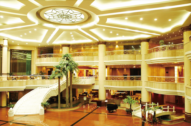 作为“酒店的灵魂”,大堂是公众对酒店的第一印象。为了营造豪华典雅的气氛,姜峰在大堂内设计了一个3.5米宽的旋转楼梯,从一楼直通二楼,在满足功能需要的同时,又丰富了大堂的空间效果。楼梯侧板及扶手以意大利雪花白异形石材构建而成,如同一条玉带,与三棵仿真棕榈树形成色彩上的对比及构图上的组合,既是整个大堂的主景之一,也是装饰施工的重点。在大堂内侧靠近商务中心的两侧墙,姜峰利用水进行空间分割,设计了两幅瀑布。瀑布流泻而下,汇聚成时曲时直的淙淙溪水,蜿蜒流至大楼梯底部。水的巧妙运用为大堂空间增添了变化和动感,也营造出宜人的自然气息。考虑到酒店立面造型的需要,姜峰选用了日本无框大幅落地清玻,以当时最新的悬挂技术进行固定。玻璃高度达6.8米,宽度最大达2.1米,这既使大堂空间在无形中得到延伸,又有效地柔化了自然光线,给人以亲切感,同时还强化了大堂的现代感。[1]这些创意和技术在今天看来并不突出,但在当时,却是“边摸索边创新”。姜峰的探索得到了业界认可,中国建筑装饰协会也在名门饭店召开了全国五星级酒店设计施工经验交流会,同行们现场观摩、交流。这既是对姜峰工作的肯定,也给了他向全国优秀设计师取经的机会,更使他以“行业内做过五星级酒店的年轻设计师”的身份开始崭露头角。
