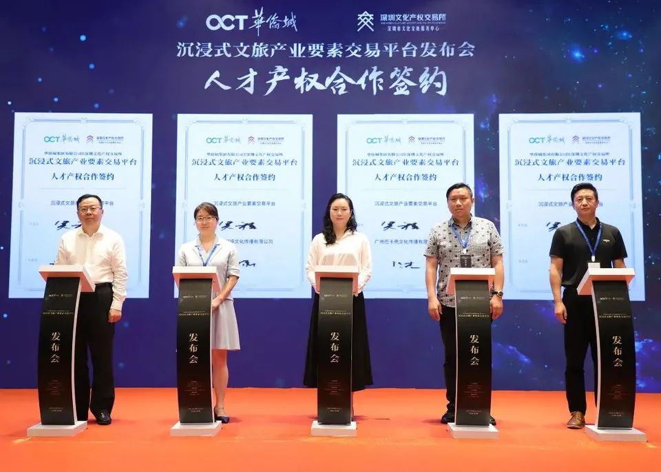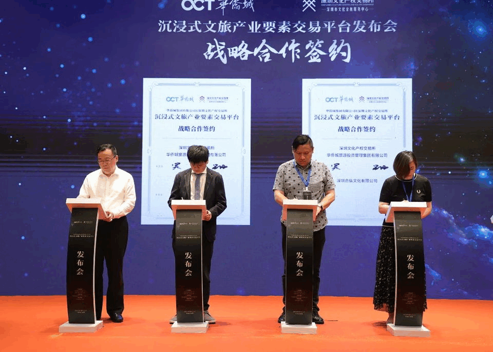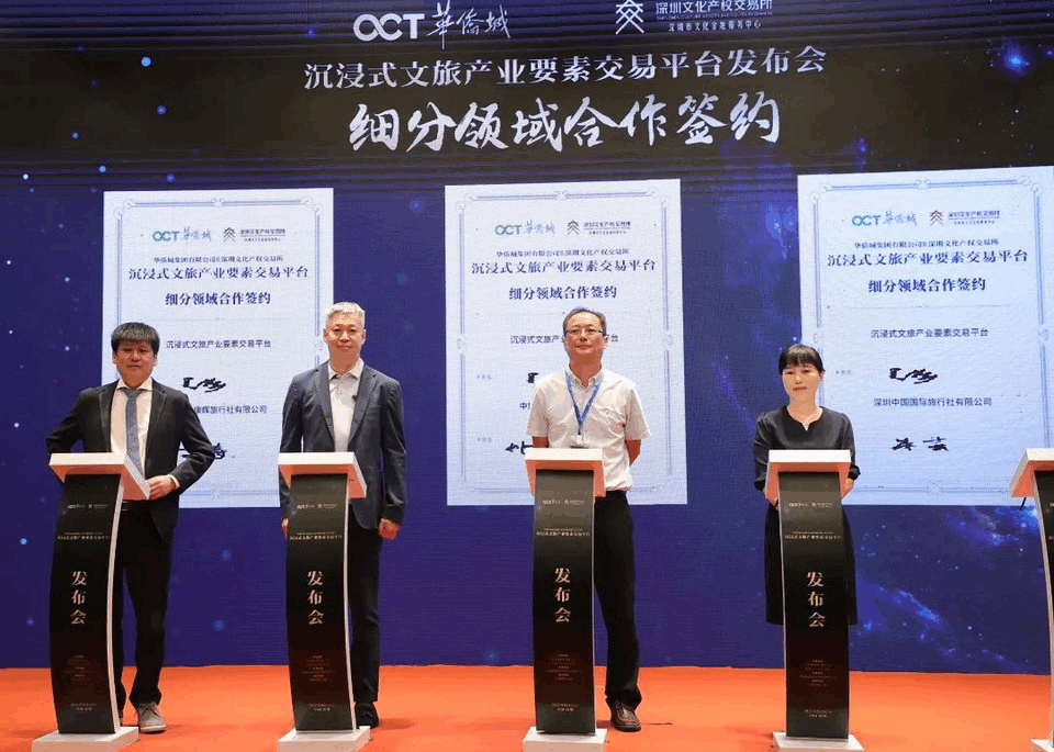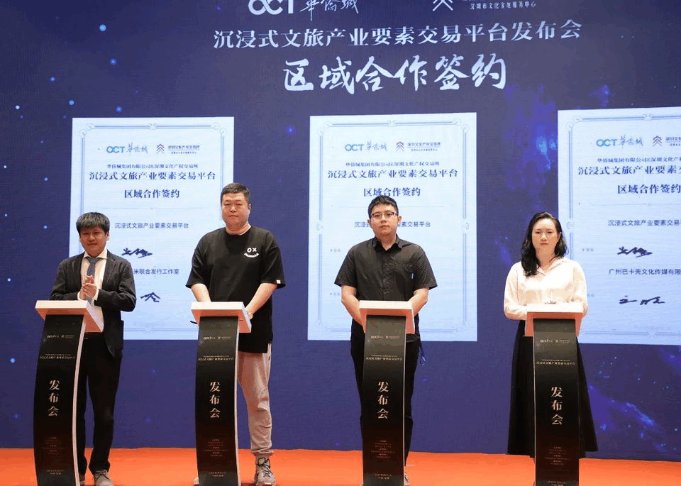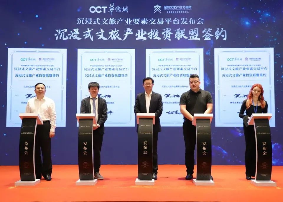 平台启动仪式在华侨城集团党委副书记、董事、总经理刘凤喜,天津市委宣传部副部长杨君毅,天津北方电影集团党委副书记、总经理李挺伟,国家信息中心新兴产业处副处长张振翼,中国公共关系协会文化大数据产业委员会副主任高凯,岭南生态文旅股份有限公司常务副总裁李云鹏,腾讯影业副总经理申少峰,上海幻境文化传播有限公司CEO江杰的共同见证下,由华侨城集团旅游研究院院长、旅游管理中心总经理、华侨城旅游投资管理集团有限公司董事、总裁张树民,深圳广电集团副总编辑、深圳文化产权交易所董事长于德江作为平台发起方代表共同启动沉浸式文旅产业要素交易平台,标志着国内首个围绕沉浸式产业的内容与IP服务,向A级景区、国有闲置资产、古村古镇、文化和旅游消费项目,提供产业要素交易和全生命周期的文旅产业投行服务平台正式启动运营。