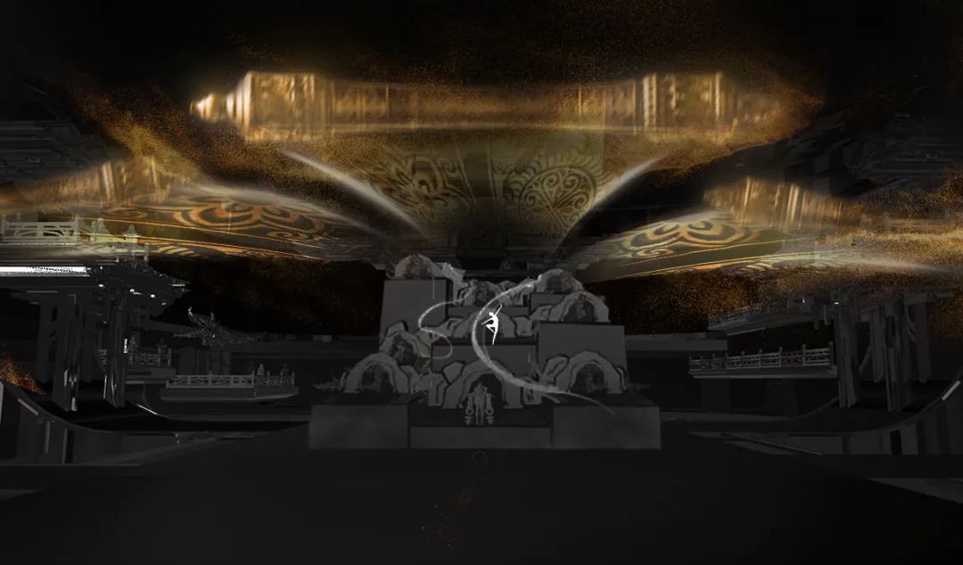 漫天黄沙逐渐将长安城覆盖,由真实物理的沙过渡到虚拟视觉的沙,繁华街市被完全沙化,形成了壮观的沙画舞美,预示着长安赛年结束,云中赛年开启。