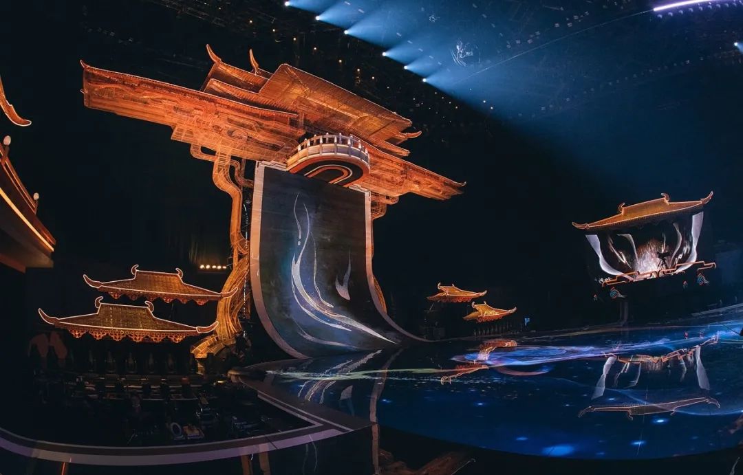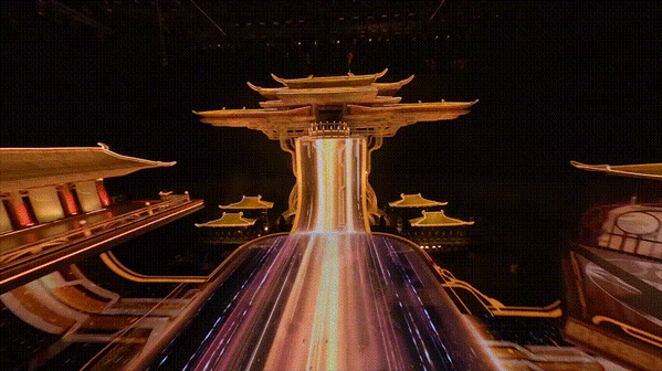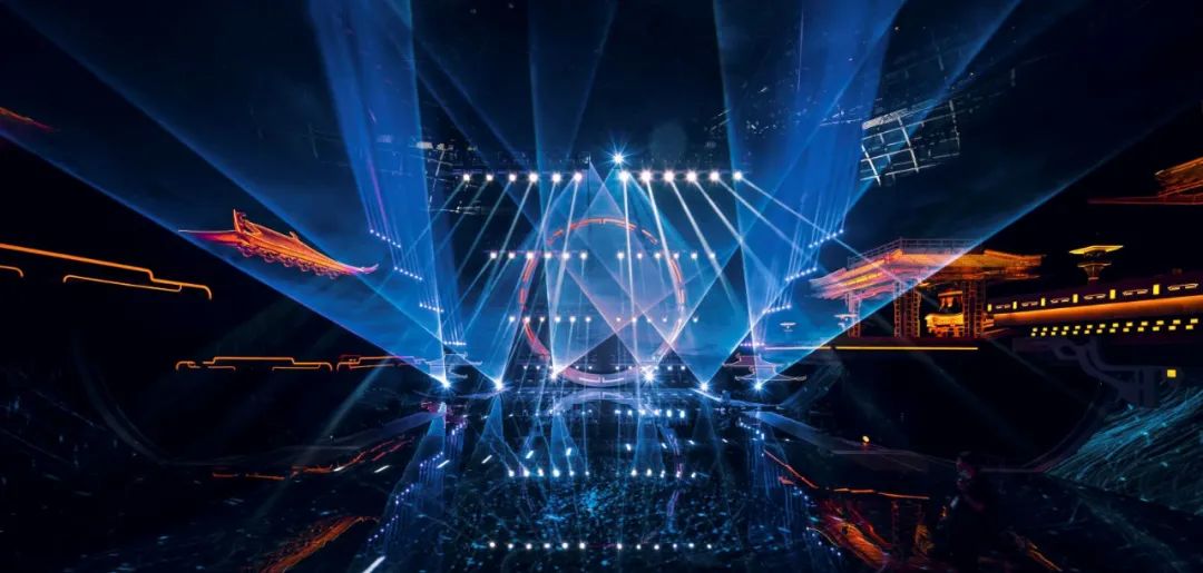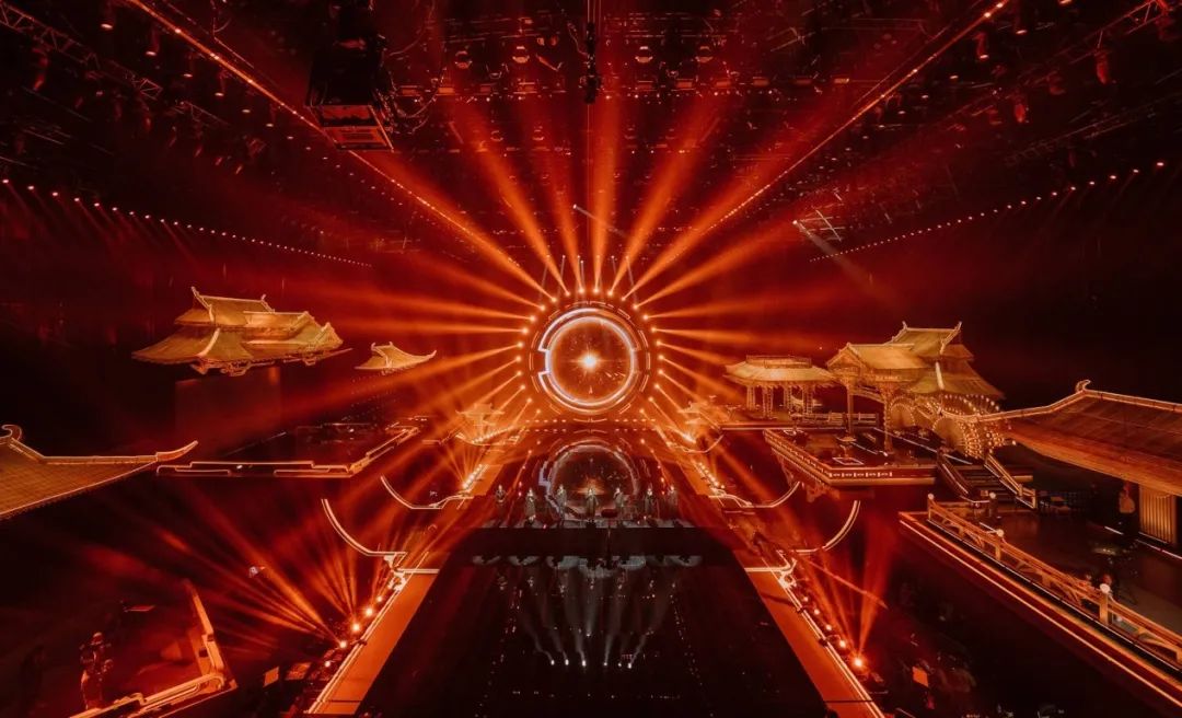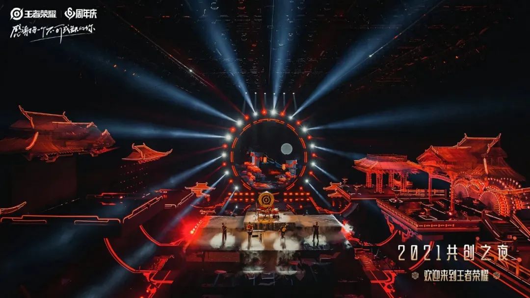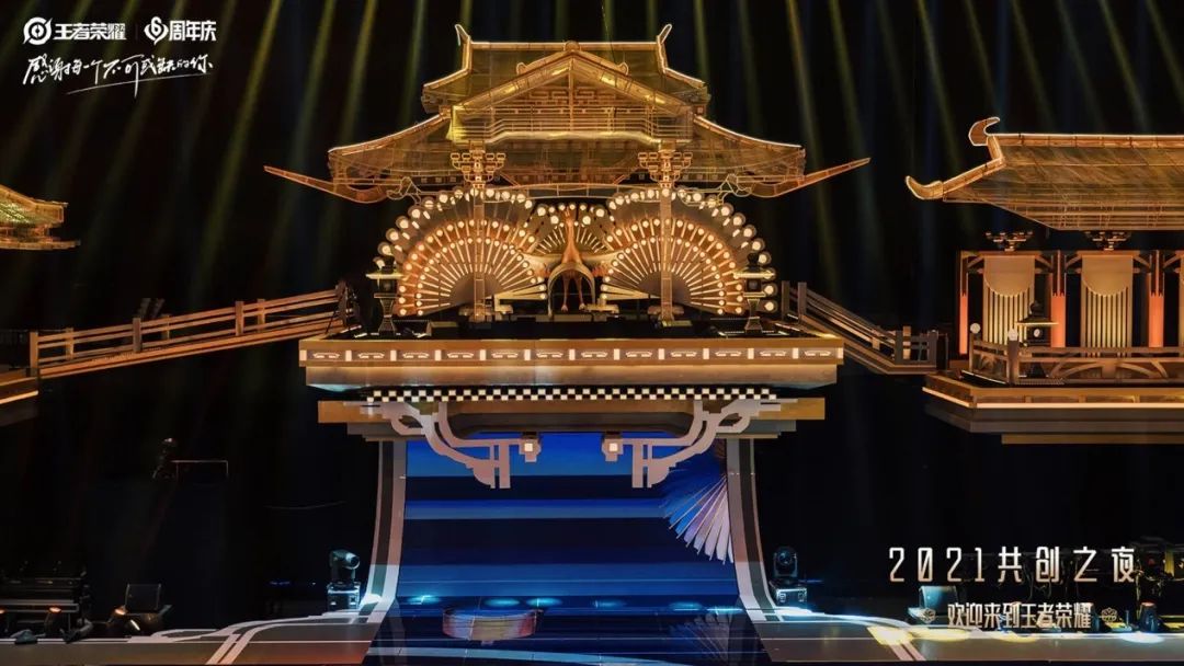 黄辉与制作人不断的讨论会议后,导演组共同达成了一个目标:王者荣耀,是属于每一个人的荣耀,每一个对王者荣耀IP有创作热爱的你的荣耀,无数个你最终汇聚成“我们”,共同构成“我们的荣耀”。最终“共创”成为晚会的内核,每个节目都紧紧围绕“共创”进行表达,通过“共创英雄梦”“共书玩家情”“共传文化美”三个篇章,重新诠释东方美学!舞美设计由致美组DESIGN赵敏&尉迟茗阅领衔完成。舞美创意原点来自“2021王者荣耀长安赛年——朱雀街”的设定。在长安朱雀街的设定上,首先确定了主ICON设计元素——朱雀街和太极宫。远处太极宫高耸矗立,威严无比,通过宽广延长的朱雀街地屏舞台进行贯穿连接,并结合地屏中间的三层9宫格数控升降,长安氛围瞬间拉满、沉浸式场景跃然纸上的同时又平添了不少变化。然而这并不足够,接下来舞美设计难点来了,共创之夜的晚会有2.5小时,节目+发布共计20多个。如何让观众审美不疲劳?如何在“朱雀街”上玩出层出不穷的“新鲜感”?这是此次舞美总设计赵敏的重要思考,于是经过长时间的打磨,在最终的舞美定稿上,沿朱雀街的经络生长出6个坊,每个坊都完全不一样。(经络是王者荣耀长安城最重要的生长脉络)左侧的三个坊演绎长安世界观的设定——郢酒坊、长乐坊、空中回廊右侧的三个坊诠释现代化场景,坊檐可升降,坊檐落下可完成长安整体氛围,坊檐升起可实现裸眼3D、灯阵舞台、直角屏互动等全方位现代化舞台。设计到此时,已拥有270度的舞台,大小共计7个舞台,但是导演组和赵敏并不满足于此,最后一个重点设计是巨型的开合圆形冰屏,背后布满灯阵,这一下为舞台的现代感增加了更多层次的调度和表达。由此, 360度全空间全场景8个舞台设置完成,并结合投影网纱盒子、投影幕布、巨型道具等多种舞美表达方式,让王者荣耀世界观的长安城跃然纸上,同时又兼具现代舞台的多样变化。如何让灯光讲故事?一个属于长安又不止于长安的故事?黄涛说看见舞美设计图的那一刻开始,他就觉得这场景一定可以讲出好故事。黄涛擅长将实景的场景感、氛围感及意境做出来,于是,在舞美基础上,黄涛在长安朱雀街上的灯光设计上可是花足了心思,调整了多版灯位图。如何将坊檐打出层次感和空间感?如何让朱雀街拥有“腰线”?赵敏在舞美设计前期就充分考虑到舞美场景与灯光设计结合的方式,并与执行总统筹李钇澄以及舞美制作总监蔡卿儒多次论证后,最终决定舞美材质在传统的喷漆焊接钢结构表面,单独热弯固定一层PVC网造型,并根据太极宫以及坊市不同层次关系再进行差异化颜色的局部喷漆,最后加装一层透明PVC瓦片,同时根据黄涛要求在坊檐内外加装了双层RGB-W变色可控灯带,在还原实景舞美造型的同时又增加了通透感,为灯光设计以及节目变化提供更多可能性和艺术感。除场景化、意境化的节目外,充满现代感的节目设计更是对灯光提出了更多的要求。在虚拟人物公孙离《一舞翩翩》节目,要提前做好准确的灯光预设给到虚拟视觉团队,在整个灯光设计和现场执行的过程中,为虚拟人物和场景做灯光调试是此次灯光最大的难点。-现场部分灯光效果-