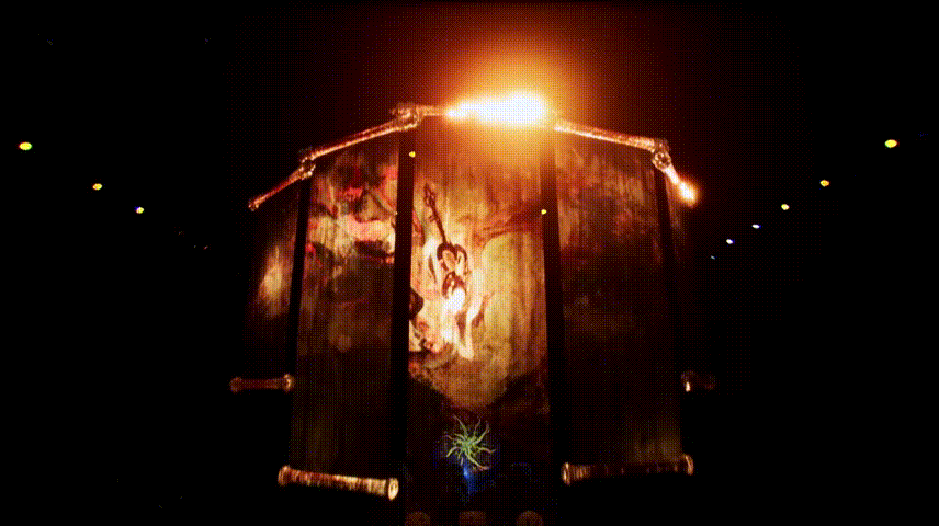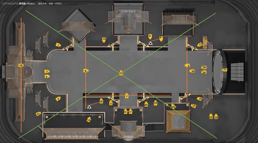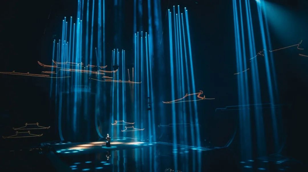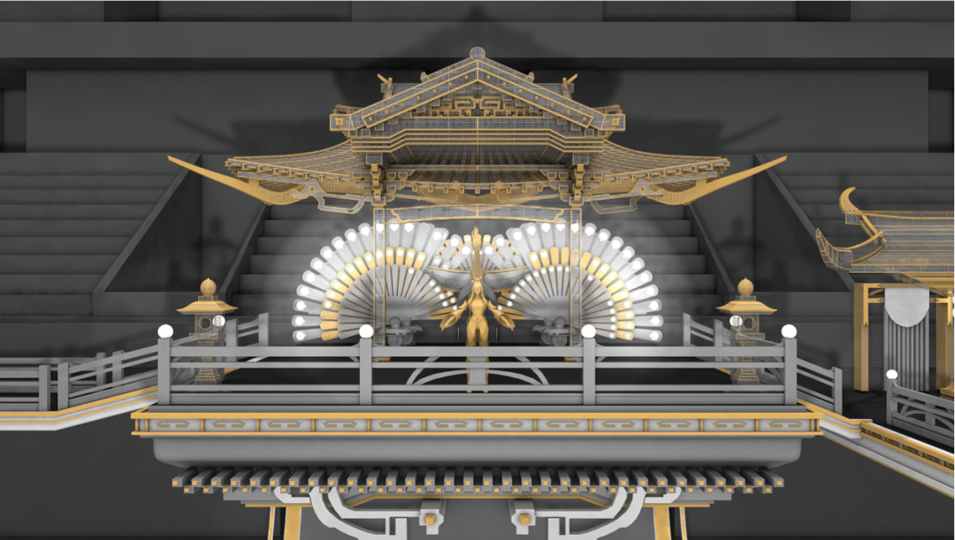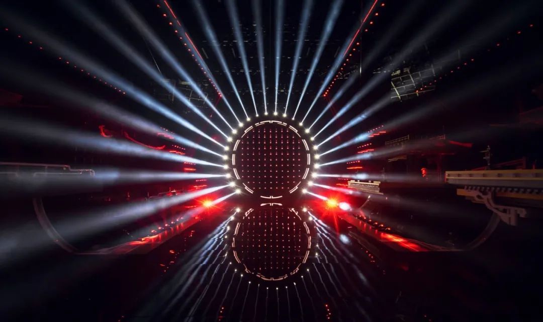 黄辉与制作人不断的讨论会议后,导演组共同达成了一个目标:王者荣耀,是属于每一个人的荣耀,每一个对王者荣耀IP有创作热爱的你的荣耀,无数个你最终汇聚成“我们”,共同构成“我们的荣耀”。最终“共创”成为晚会的内核,每个节目都紧紧围绕“共创”进行表达,通过“共创英雄梦”“共书玩家情”“共传文化美”三个篇章,重新诠释东方美学!舞美设计由致美组DESIGN赵敏&尉迟茗阅领衔完成。舞美创意原点来自“2021王者荣耀长安赛年——朱雀街”的设定。在长安朱雀街的设定上,首先确定了主ICON设计元素——朱雀街和太极宫。远处太极宫高耸矗立,威严无比,通过宽广延长的朱雀街地屏舞台进行贯穿连接,并结合地屏中间的三层9宫格数控升降,长安氛围瞬间拉满、沉浸式场景跃然纸上的同时又平添了不少变化。然而这并不足够,接下来舞美设计难点来了,共创之夜的晚会有2.5小时,节目+发布共计20多个。如何让观众审美不疲劳?如何在“朱雀街”上玩出层出不穷的“新鲜感”?这是此次舞美总设计赵敏的重要思考,于是经过长时间的打磨,在最终的舞美定稿上,沿朱雀街的经络生长出6个坊,每个坊都完全不一样。(经络是王者荣耀长安城最重要的生长脉络)左侧的三个坊演绎长安世界观的设定——郢酒坊、长乐坊、空中回廊右侧的三个坊诠释现代化场景,坊檐可升降,坊檐落下可完成长安整体氛围,坊檐升起可实现裸眼3D、灯阵舞台、直角屏互动等全方位现代化舞台。设计到此时,已拥有270度的舞台,大小共计7个舞台,但是导演组和赵敏并不满足于此,最后一个重点设计是巨型的开合圆形冰屏,背后布满灯阵,这一下为舞台的现代感增加了更多层次的调度和表达。由此, 360度全空间全场景8个舞台设置完成,并结合投影网纱盒子、投影幕布、巨型道具等多种舞美表达方式,让王者荣耀世界观的长安城跃然纸上,同时又兼具现代舞台的多样变化。如何让灯光讲故事?一个属于长安又不止于长安的故事?黄涛说看见舞美设计图的那一刻开始,他就觉得这场景一定可以讲出好故事。黄涛擅长将实景的场景感、氛围感及意境做出来,于是,在舞美基础上,黄涛在长安朱雀街上的灯光设计上可是花足了心思,调整了多版灯位图。如何将坊檐打出层次感和空间感?如何让朱雀街拥有“腰线”?赵敏在舞美设计前期就充分考虑到舞美场景与灯光设计结合的方式,并与执行总统筹李钇澄以及舞美制作总监蔡卿儒多次论证后,最终决定舞美材质在传统的喷漆焊接钢结构表面,单独热弯固定一层PVC网造型,并根据太极宫以及坊市不同层次关系再进行差异化颜色的局部喷漆,最后加装一层透明PVC瓦片,同时根据黄涛要求在坊檐内外加装了双层RGB-W变色可控灯带,在还原实景舞美造型的同时又增加了通透感,为灯光设计以及节目变化提供更多可能性和艺术感。除场景化、意境化的节目外,充满现代感的节目设计更是对灯光提出了更多的要求。在虚拟人物公孙离《一舞翩翩》节目,要提前做好准确的灯光预设给到虚拟视觉团队,在整个灯光设计和现场执行的过程中,为虚拟人物和场景做灯光调试是此次灯光最大的难点。-现场部分灯光效果-
