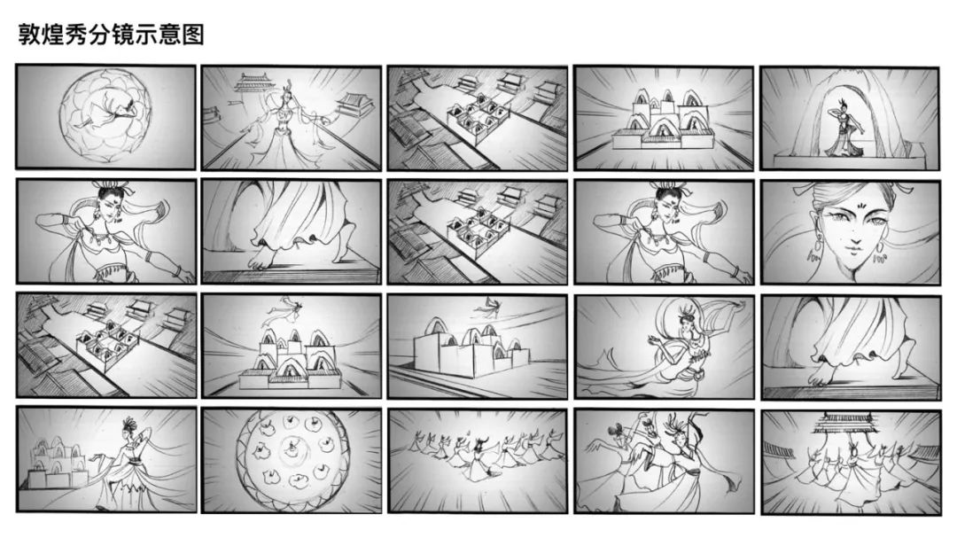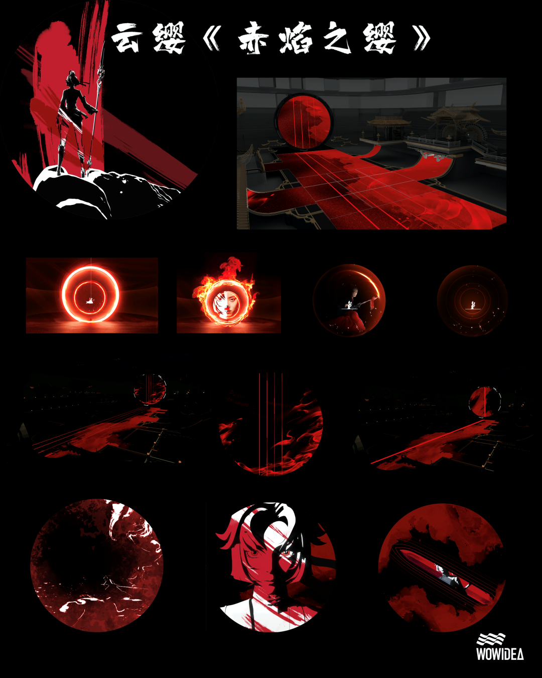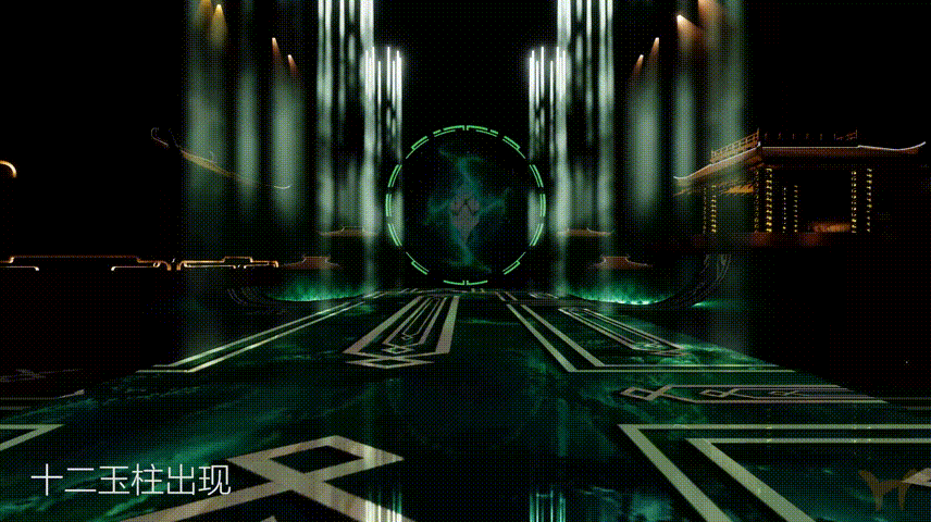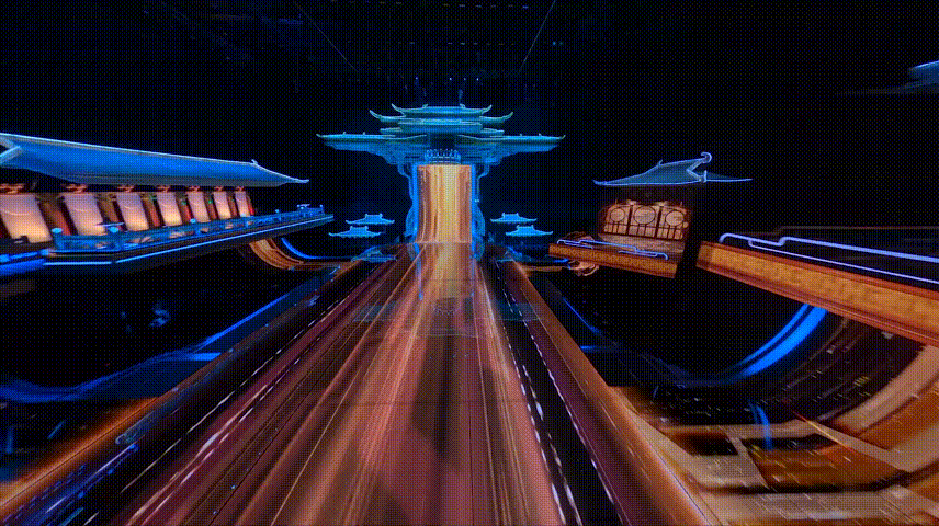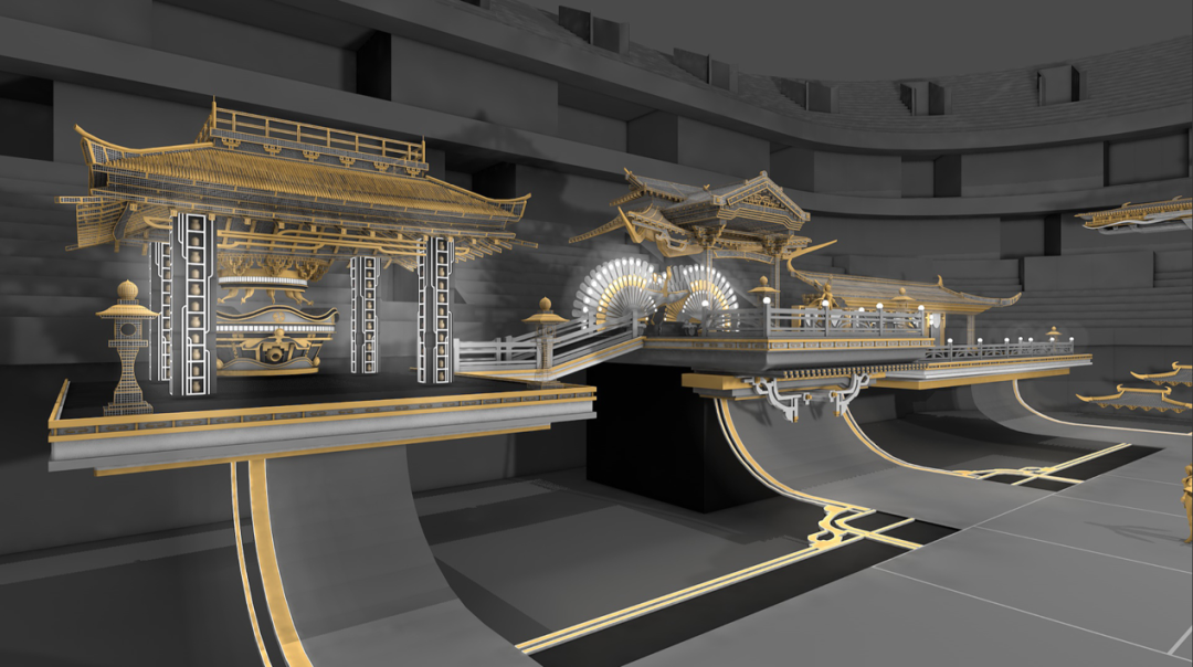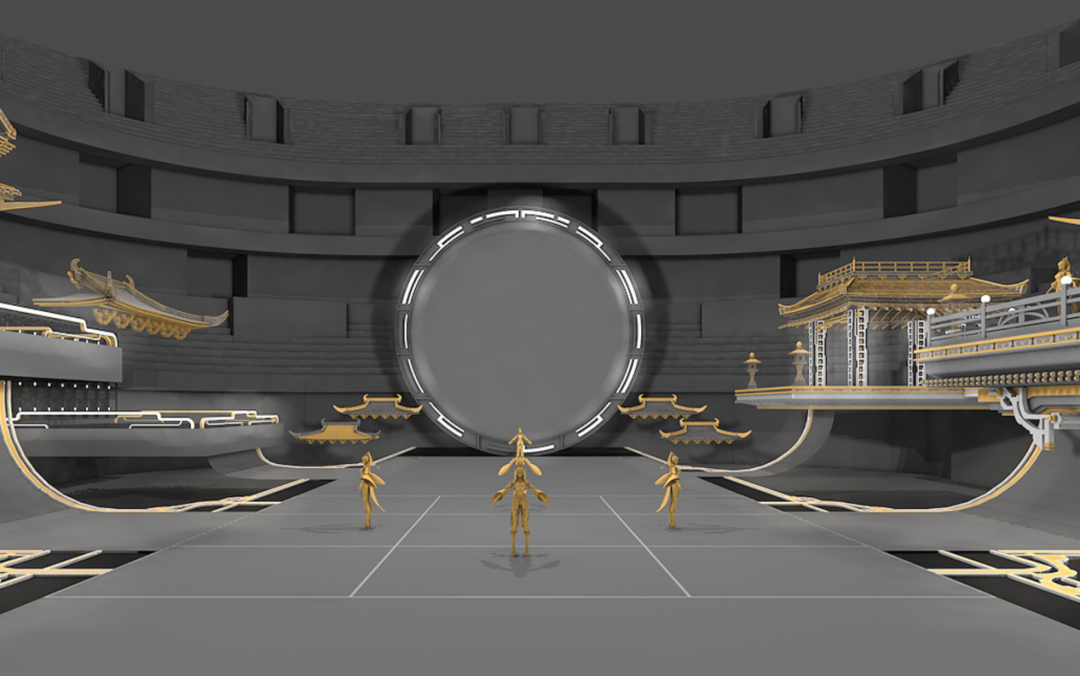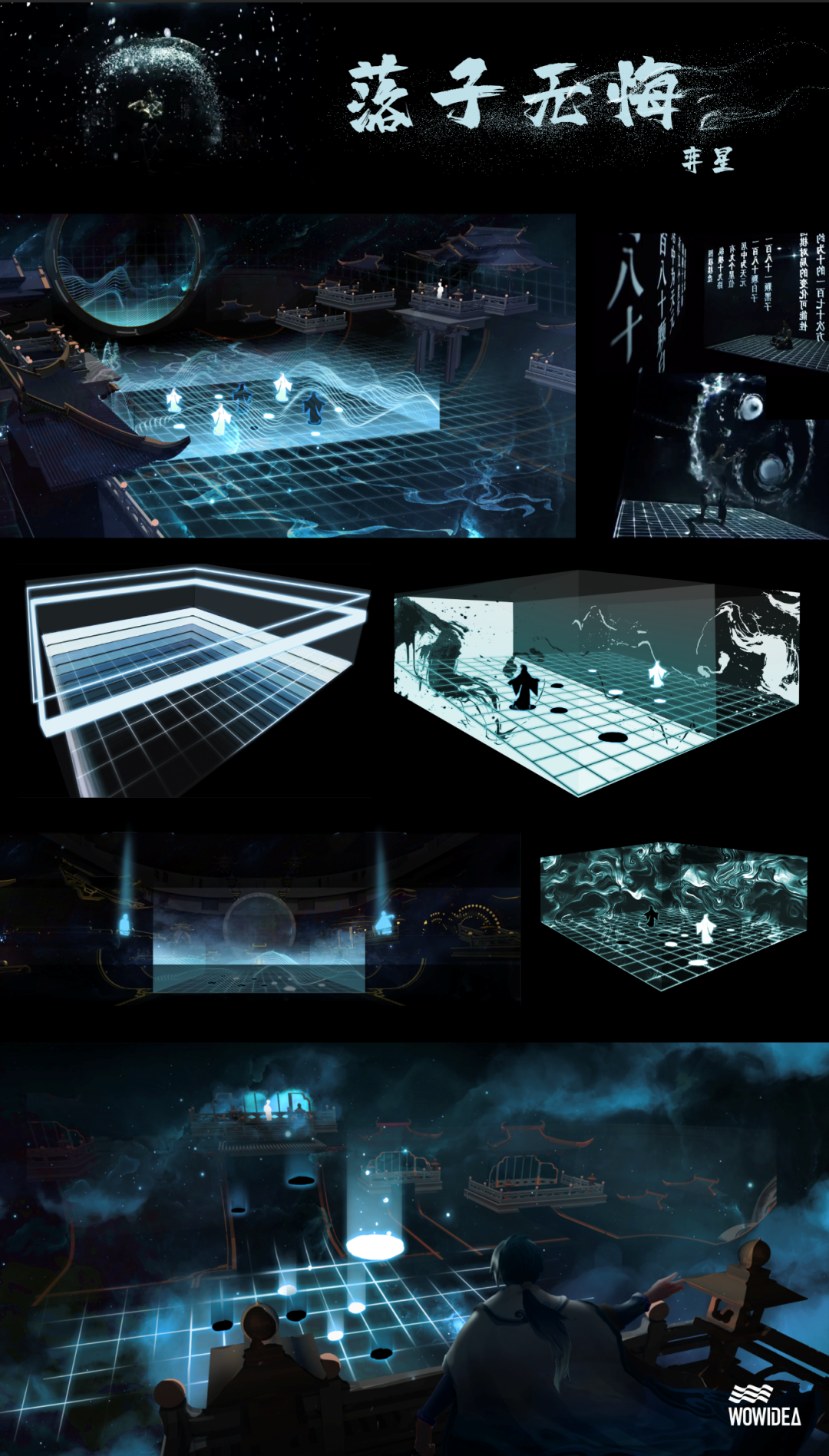 而为了表达英雄来到云中漠地的惊喜感和仪式感,虚拟团队通过粒子组成的沙海形成一个类似“虫洞”般的时空隧道。360度全景舞台如何拍摄?如何把节目拍出MV质感?在舞美设计图的过程中,导演组与导播团队就每一面舞台及节目的使用都做了缜密的沟通,360度无死角舞台,机器无处可藏,对于导播团队而言是一个不小的考验。此次的现场机位共计30个,并设有虚拟飞猫、穿梭机、跳楼机等多个特种设备,导演组和导播团队只有一个共同的目标,就是一定要把每一个节目当成MV拍摄,要把360度舞台真正拍活了。为此,在项目前期,MAXMAD聘请专业分镜动画师,针对每一个节目做了大量的舞美预演分镜手绘图。在项目后期,导播团队又单独针对重点节目梳理并绘制拍摄分镜脚本,并在拍摄期间场记实时记录每一遍镜头和每一个机位,确保分镜脚本设定的画面100%完成。360度全场景与LED大屏缔造了一座“不夜长安”古城,多种风格的沉浸式视觉感受,通过背景屏幕影像与地面影像的互动融合,形成虚实结合的视像空间,实现恢弘壮阔、如梦如真的高清盛宴。《赤焰之缨》的设计灵感来源于英雄与玩家的故事,想表达的核心理念是:每个人的心中都住着一个英雄,某时起,你将与英雄身心合一,英雄可以为你带来力量,让你成为更好的自己。二次元的动画形式体现了“敢上九重破云,常去四海濯缨。”的云缨角色,红白黑撞色搭配中式的笔触画风衬托出人物英姿飒爽和神采飞动。以火为缨,以枪为谱,在“大弦嘈嘈如急雨”的琵琶声中,用指尖操作秀出神枪掠火的枪火少女刚毅而有力量的一面。整体视觉构建以血色竹林为场景包装,凸显凌云仗剑红尘的侠客气质,并结合琵琶与音波呼应的律动感,配上云缨掠火枪的“火”作为视觉icon,打造一场充满中国元素的听觉、视觉双重盛宴。世界围棋冠军著名围棋棋手古力与CG动画人物弈星上演了一场“异空间”的棋艺对决,舞台中间用裸眼3D呈现虚拟棋盘,两人在棋盘的两边展开对势,从容且果敢。棋盘中黑衣与白衣舞者翩翩起舞,由少至多,模拟出棋子的黑白对弈。棋盘用四面全息投影纱幕增加立体感,让网格方块悦动起来,配合舞蹈感受融合碰撞之美。舞者身着白色和黑色的服装,配合地屏裸眼3D效果呈现一个巨大的棋盘,舞者动如棋子,每一次跳跃都在诠释着奕星与古力新一局的对弈。晚会视觉设计团队可事传媒在本次项目中,围绕 Notch与虚幻4高效的实时渲染引擎搭建全流程解决方案,借助虚幻引擎与NOTCH的结合,在视觉制作的时效性与创新性做出了更加有力的尝试。“敦者,大也,煌者,胜也,敦煌者”,盛大辉煌之意穿越敦煌千年历史,重现中华文明史诗,青年舞蹈家、古典舞女神华宵一献上一场跨越时空的史诗音画,通过聆听古老、遥远而神秘的敦煌之声展现敦煌古乐器无穷的艺术魅力,在讲述王者世界中胡旋舞伎故事的同时传递大唐盛世下对文化的融合、包容的态度。《音你心动》节目设计
