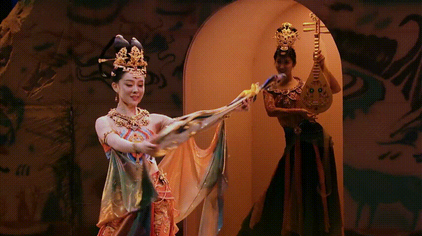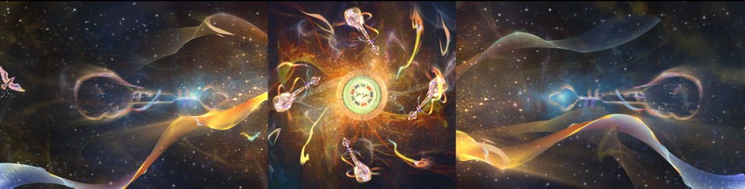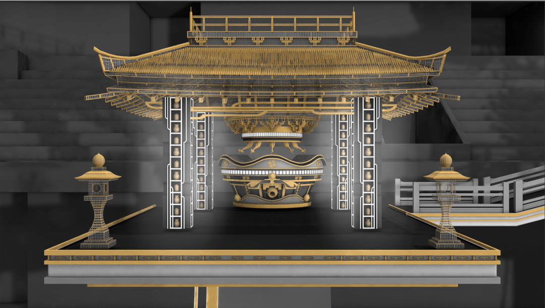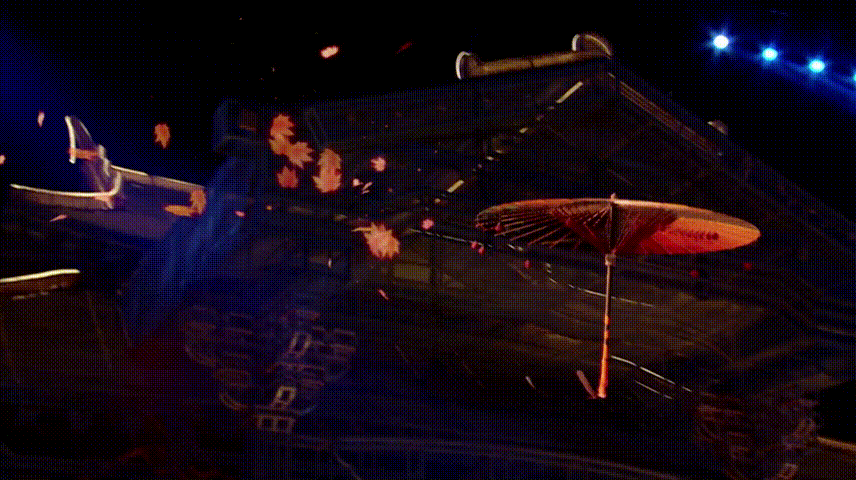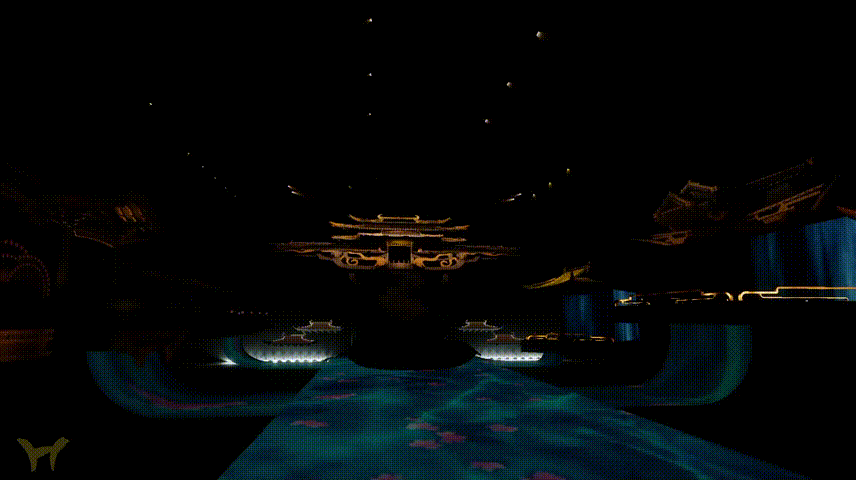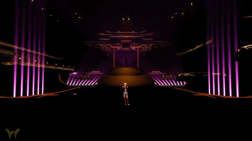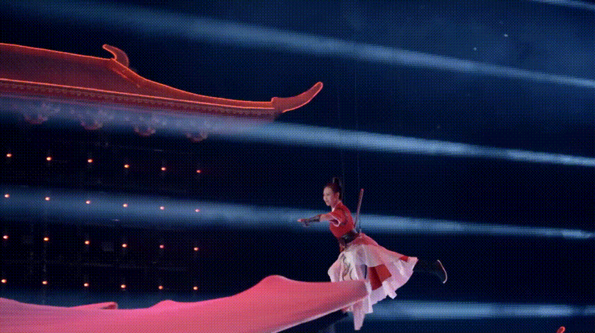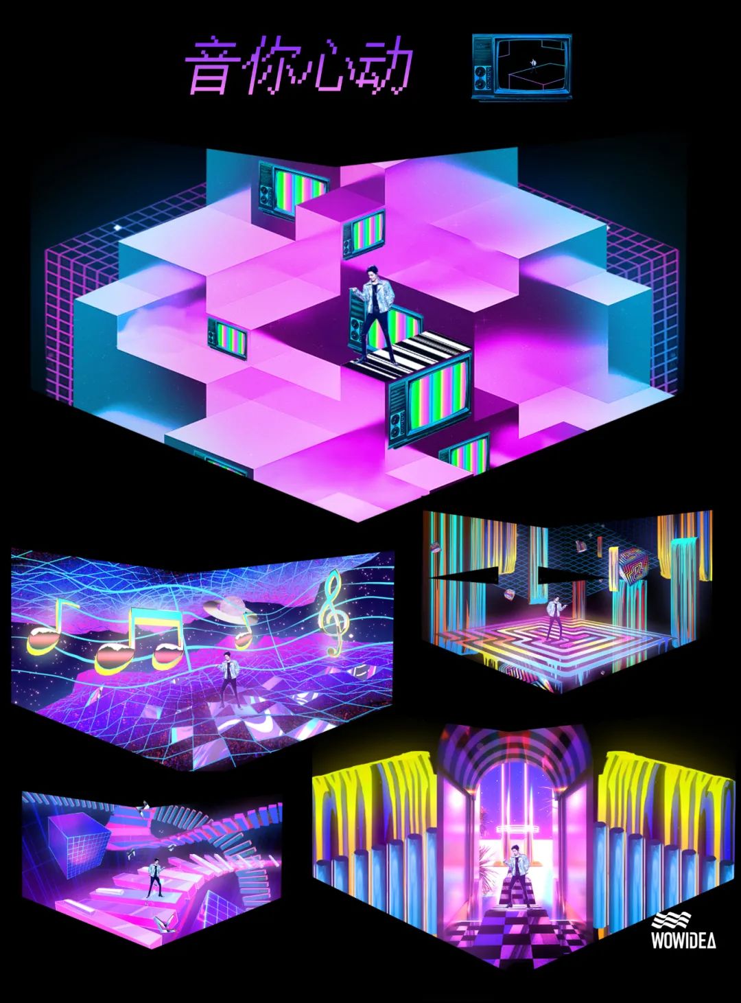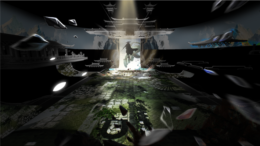而为了表达英雄来到云中漠地的惊喜感和仪式感,虚拟团队通过粒子组成的沙海形成一个类似“虫洞”般的时空隧道。360度全景舞台如何拍摄?如何把节目拍出MV质感?在舞美设计图的过程中,导演组与导播团队就每一面舞台及节目的使用都做了缜密的沟通,360度无死角舞台,机器无处可藏,对于导播团队而言是一个不小的考验。此次的现场机位共计30个,并设有虚拟飞猫、穿梭机、跳楼机等多个特种设备,导演组和导播团队只有一个共同的目标,就是一定要把每一个节目当成MV拍摄,要把360度舞台真正拍活了。为此,在项目前期,MAXMAD聘请专业分镜动画师,针对每一个节目做了大量的舞美预演分镜手绘图。在项目后期,导播团队又单独针对重点节目梳理并绘制拍摄分镜脚本,并在拍摄期间场记实时记录每一遍镜头和每一个机位,确保分镜脚本设定的画面100%完成。360度全场景与LED大屏缔造了一座“不夜长安”古城,多种风格的沉浸式视觉感受,通过背景屏幕影像与地面影像的互动融合,形成虚实结合的视像空间,实现恢弘壮阔、如梦如真的高清盛宴。《赤焰之缨》的设计灵感来源于英雄与玩家的故事,想表达的核心理念是:每个人的心中都住着一个英雄,某时起,你将与英雄身心合一,英雄可以为你带来力量,让你成为更好的自己。二次元的动画形式体现了“敢上九重破云,常去四海濯缨。”的云缨角色,红白黑撞色搭配中式的笔触画风衬托出人物英姿飒爽和神采飞动。以火为缨,以枪为谱,在“大弦嘈嘈如急雨”的琵琶声中,用指尖操作秀出神枪掠火的枪火少女刚毅而有力量的一面。整体视觉构建以血色竹林为场景包装,凸显凌云仗剑红尘的侠客气质,并结合琵琶与音波呼应的律动感,配上云缨掠火枪的“火”作为视觉icon,打造一场充满中国元素的听觉、视觉双重盛宴。世界围棋冠军著名围棋棋手古力与CG动画人物弈星上演了一场“异空间”的棋艺对决,舞台中间用裸眼3D呈现虚拟棋盘,两人在棋盘的两边展开对势,从容且果敢。棋盘中黑衣与白衣舞者翩翩起舞,由少至多,模拟出棋子的黑白对弈。棋盘用四面全息投影纱幕增加立体感,让网格方块悦动起来,配合舞蹈感受融合碰撞之美。舞者身着白色和黑色的服装,配合地屏裸眼3D效果呈现一个巨大的棋盘,舞者动如棋子,每一次跳跃都在诠释着奕星与古力新一局的对弈。晚会视觉设计团队可事传媒在本次项目中,围绕 Notch与虚幻4高效的实时渲染引擎搭建全流程解决方案,借助虚幻引擎与NOTCH的结合,在视觉制作的时效性与创新性做出了更加有力的尝试。“敦者,大也,煌者,胜也,敦煌者”,盛大辉煌之意穿越敦煌千年历史,重现中华文明史诗,青年舞蹈家、古典舞女神华宵一献上一场跨越时空的史诗音画,通过聆听古老、遥远而神秘的敦煌之声展现敦煌古乐器无穷的艺术魅力,在讲述王者世界中胡旋舞伎故事的同时传递大唐盛世下对文化的融合、包容的态度。《音你心动》节目设计