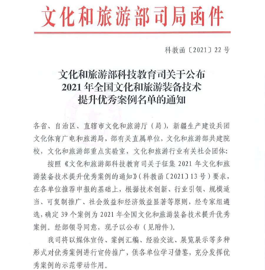 近日,国家文化和旅游部公布了“2021年全国文化和旅游装备技术提升优秀案例”名单,广州市浩洋电子股份有限公司倾心打造的《新型舞台灯具在舞台剧《遵义1935》应用》成功入选优秀项目名单。
