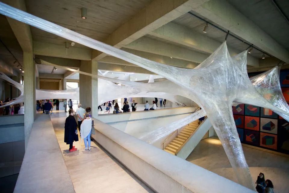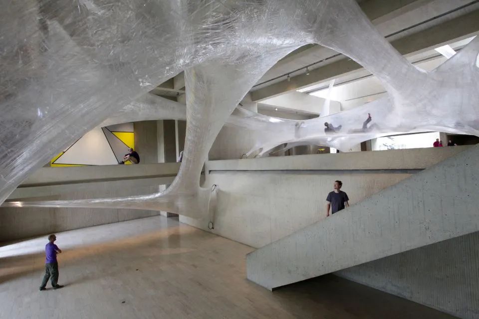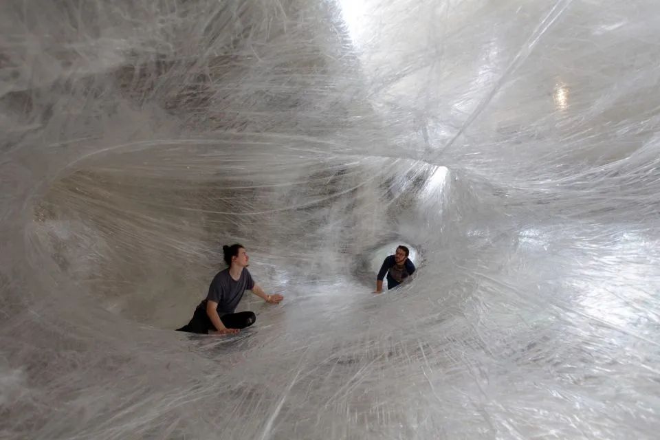 这个互动装置,简称为《Tape(胶带)》,完全由透明的包装胶带材料制作而成,悬挂在这座由贝聿铭设计的艺术中心内。创作者希望参观者从内到外地去探索这件装置作品,参观者可以穿着袜子并沿顺时针方向穿过其中。