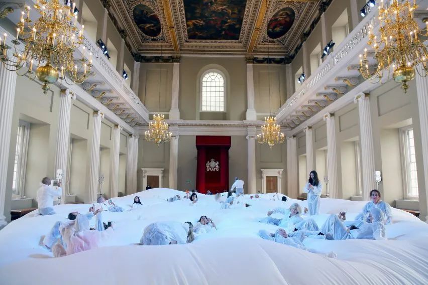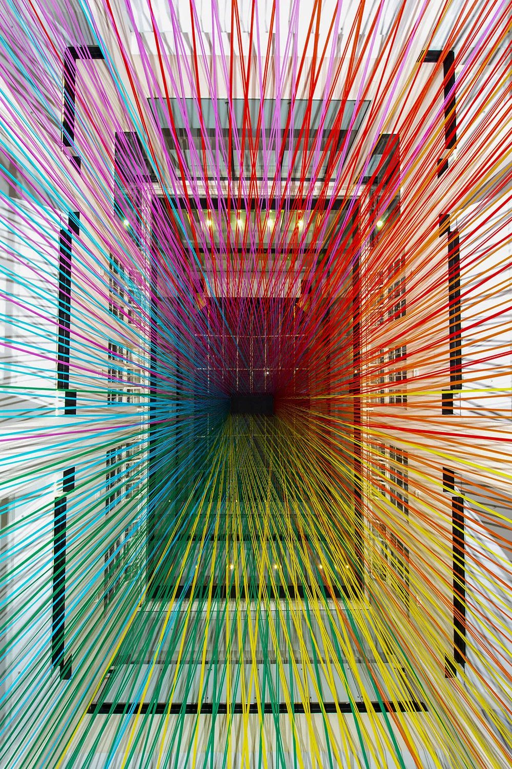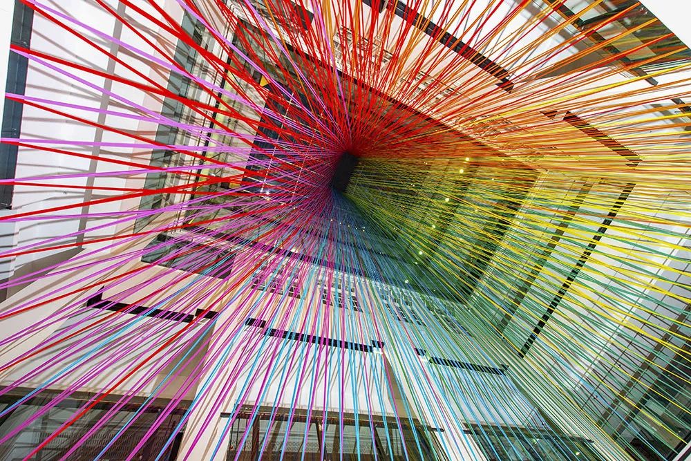 在几名志愿者的帮助下,这个悬浮胶带艺术装置,用14公里(46,000英尺)长的胶带制作而成。从外观造型上来看,该装置就像一个旋转的彩色龙卷风,占据了这座建筑的内部空间。
