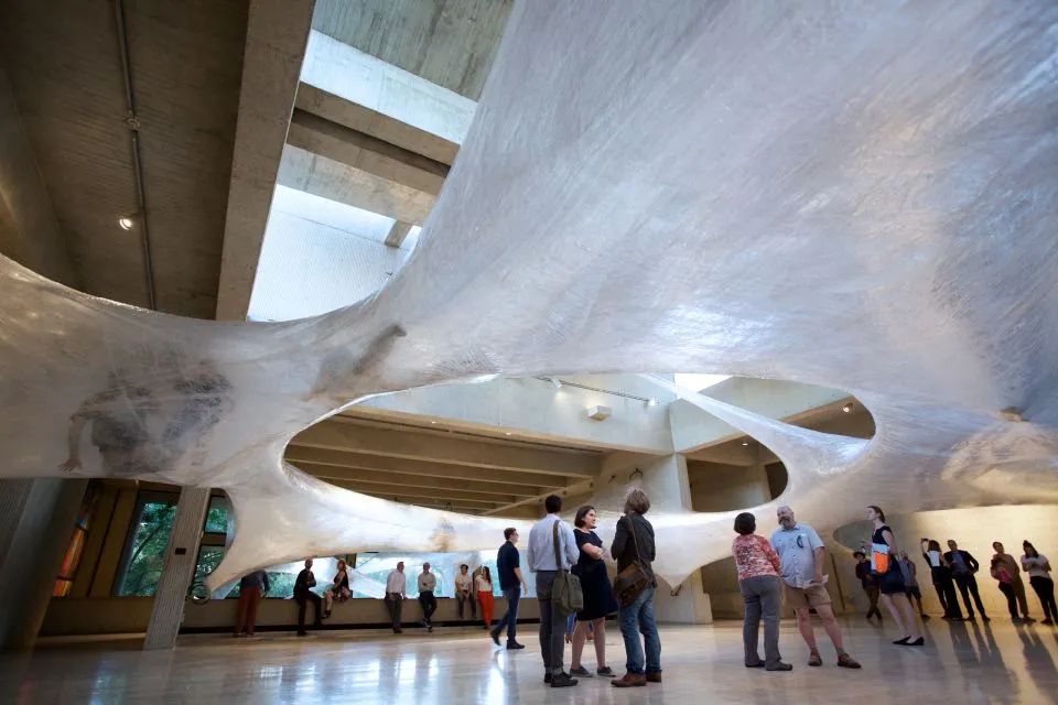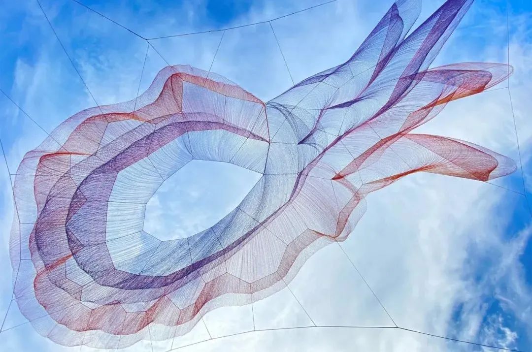Janet Echelman 的地球时间系列之绳结装置,广泛悬挂在公共广场和公园之中,是对地球生命遭受的破坏性、压倒性以及无法控制的力量做出的回应。