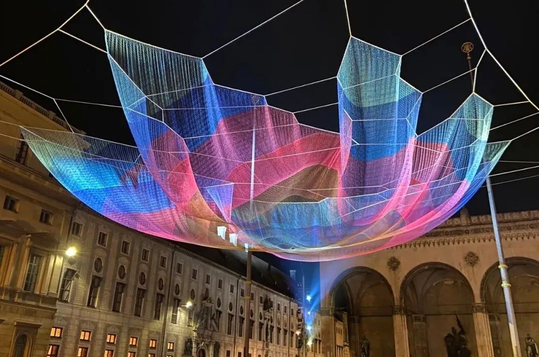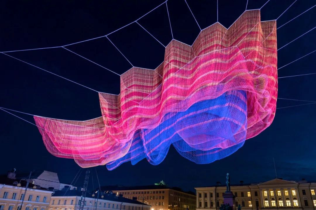 Janet Echelman将尼龙和聚氨酯纤维材质编织成条纹编织物,夜幕降临时,嵌入灯光的光芒,笼罩在路人上空。一阵风吹过,这个巨大的无固定形态的绳结团块,随机变成新的形状。