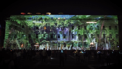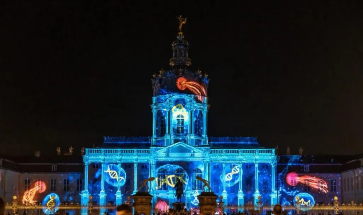 在波兰创意团队 Clockwork 的视频映射中,巴洛克风格的夏洛滕堡宫首先被迪斯科球照亮,随着节拍起舞,然后立面变成玻璃结构,鲸鱼在宇宙环境中游泳,气泡和孩子们一起变成球......
