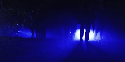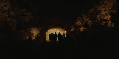 小路被薄雾中的金色灯光点亮,沿着昏暗的小路前行,树梢闪烁,树影婆娑。