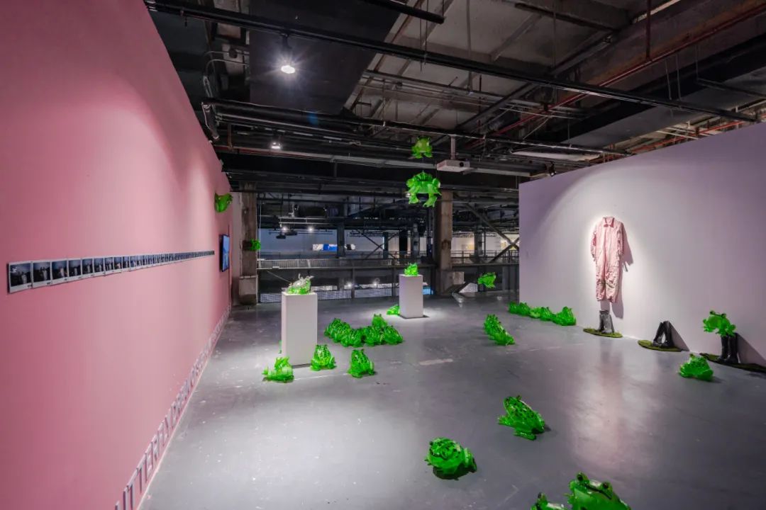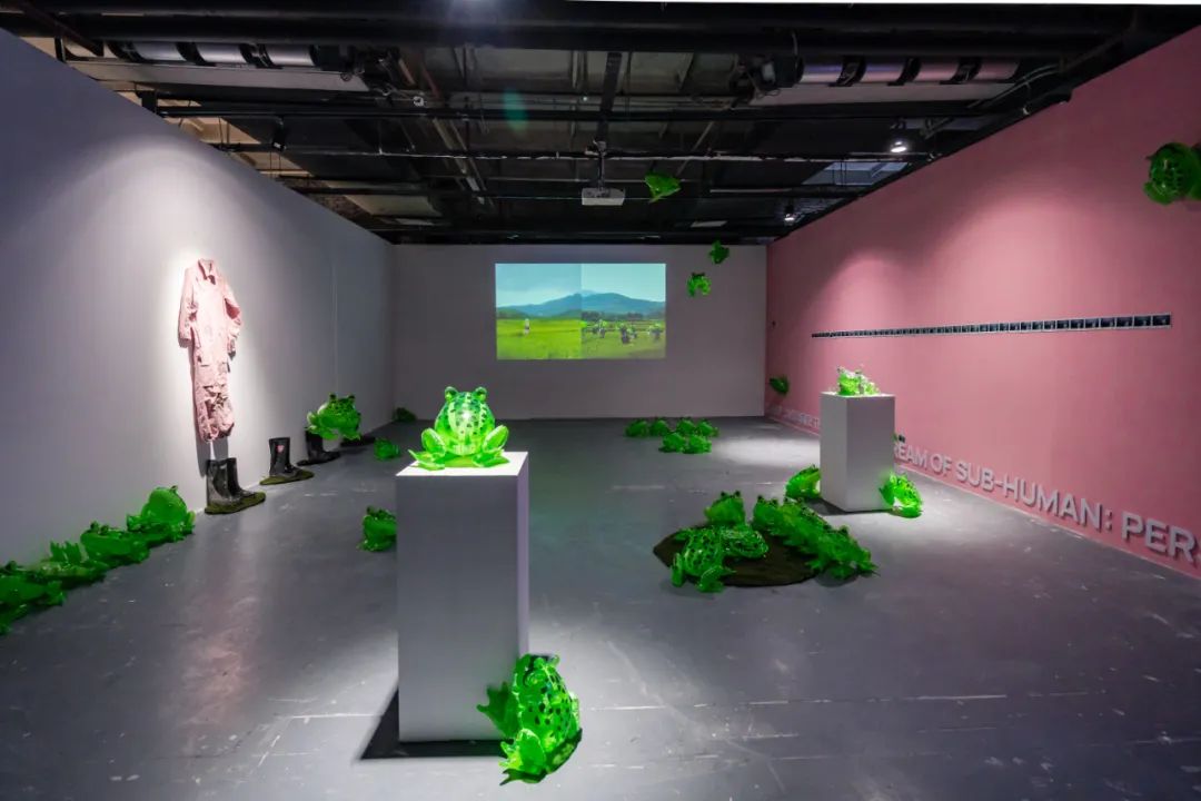 “亚人蝶梦 :伪装异闻录”单元基于艺术家陶心琪自 2019 年以来,构建的观念性表演系统与视觉符号。“亚人”可以成为世界任何事物的拟真,成为任何人的精神投射。此次带来的项目《亚人蝶梦:伪装异闻录》中,“亚人”作为具备角色视角的“社会窥视器”与“合作发生装 置”。目前在11月至12月展出的是计划1“经济与雇佣行为”,现场作品 《田野临时工作有限公司》由一鵲与陶心琪(亚人)创作。现场的视频所放映的,是艺术家以80元每小时的价格雇佣农民在稻田里拿着绿色的塑料青蛙,并模仿青蛙的叫声。计划2 “臆想的自我肖像,扩音器”将于2022年1至2月展出。