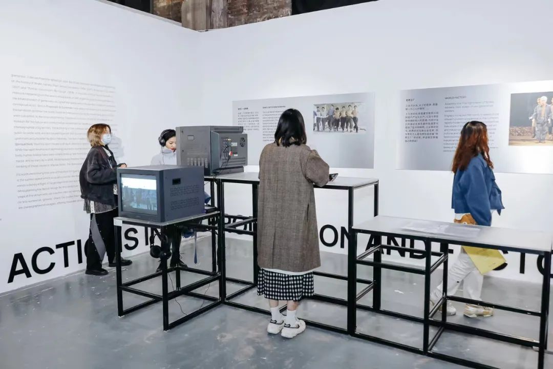 展览的序幕名为“生产行动”,以美术馆建筑的历史作为叙事的起点,邀请观众凝视历史的现场。美术馆的前身是上海造纸机械厂(简称“上造厂”),现场展示了报纸的复印件、工厂印刷品原件,并展示了明和电机社长土佐信道在仍是待开发的废弃工厂中刷涂机器的剧场集体创作影像。而这个序幕被放置在展览入口前,也呼应美术馆在试运营阶段所举办的展览“明和电机:超常识机械”。正是基于上海造纸机械厂的空间逻辑,才有了展览中的草台班《世界工厂》文慧《和民工一起跳舞》等作品,还有对于上海工人文化宫的研究,以及上海造纸机械厂工友返厂茶话会的发生。