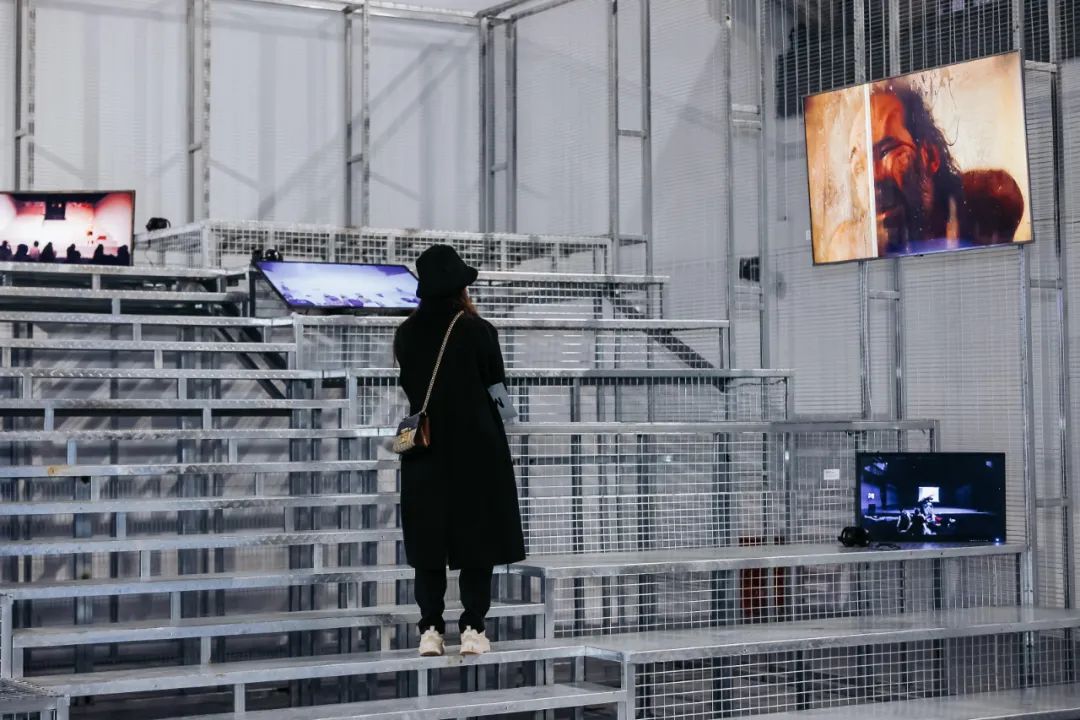 美术馆最吸引人的场地特点在其下沉式的剧场空间,一个大型台阶成为过去表演项目的观众坐席。在此次展览场地的规划中,美术馆在其对面复刻了一个金属台阶的“骨架”,作为“身体演绎”板块的录像展示区域。在这个“幽灵”看台上,那些在美术馆历史现场中闪烁的身体被屏幕再次编排。