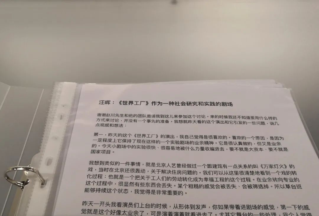 草台班集体创作的《世界工厂》是进入展览后看到的第一件作品,以纪录剧场的形式讲述世界工厂最早从欧洲出现以及在中国发展中的时间、空间和变迁;同时,交织了一位年轻人参与这出戏的创作过程中,他个人的成长经验也成为了作品的一部分。