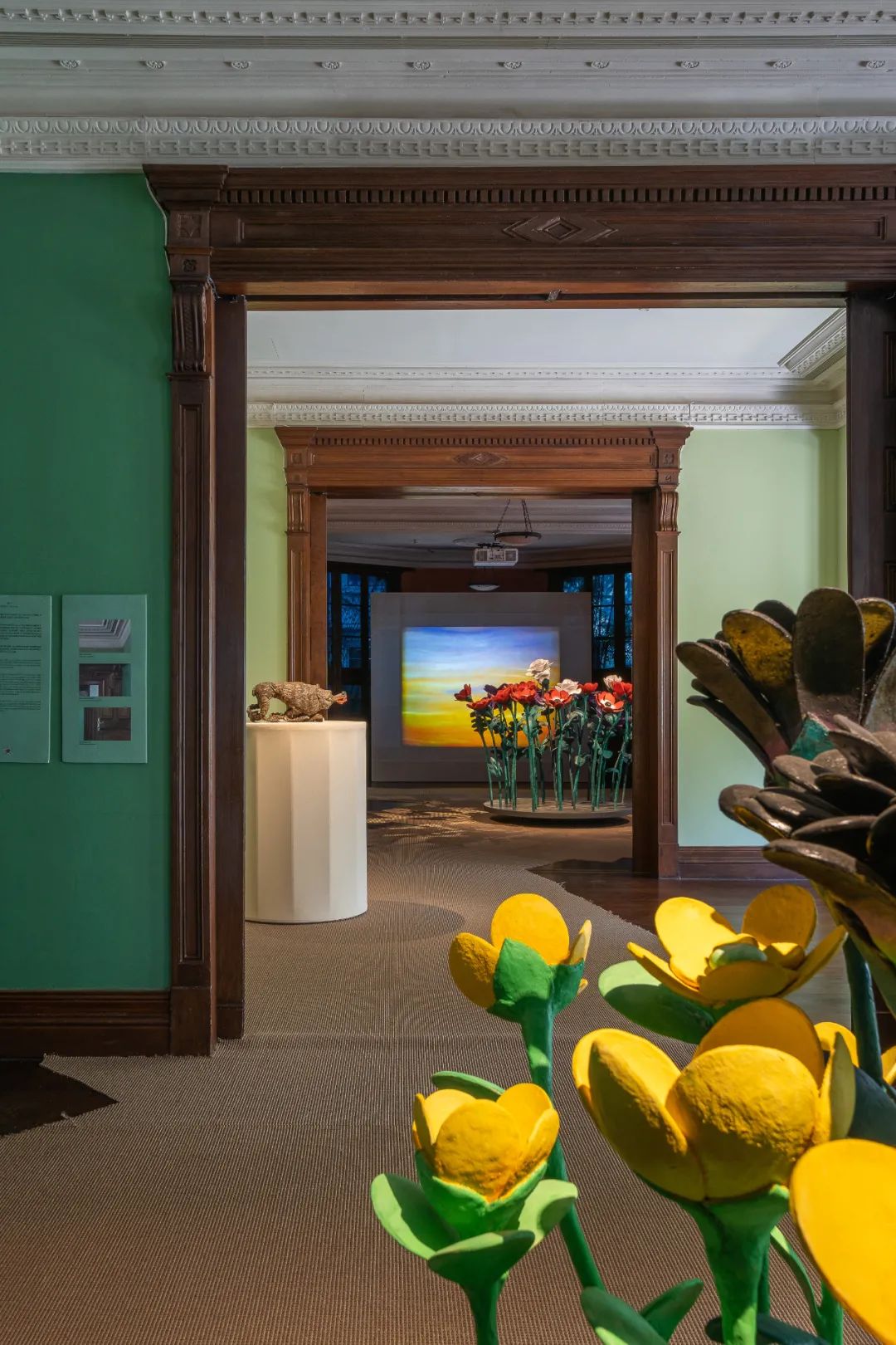 在 PRADA荣宅,勇敢地踩上那块锯齿型的地毯,看到影像中的花束(作品《The Clearing,WHITE, RED AND PURPLE》)和怪物(作品《Bear》)变成实实在在的硕大雕塑,童话里的怪物就来了——那个怪物就是你。幽暗的小屋玻璃窗上映出你的影子,而你将目光投向里面悬吊着的小雕塑(作品《Flower Fly》),发现你的影子和这个孤绝在一隅的小雕塑叠加在一起,现在,你的意识附着怪物的形体,置身在一个倒错的梦魇中,然后就从那个洋葱结构的展厅说起。