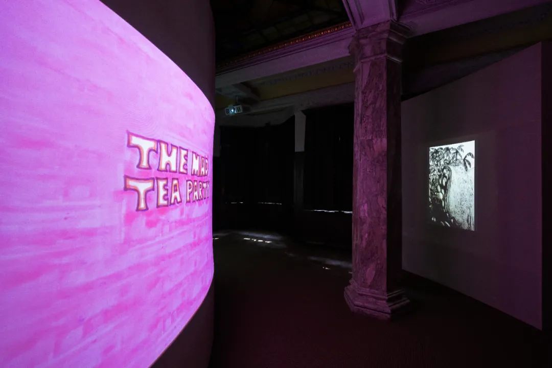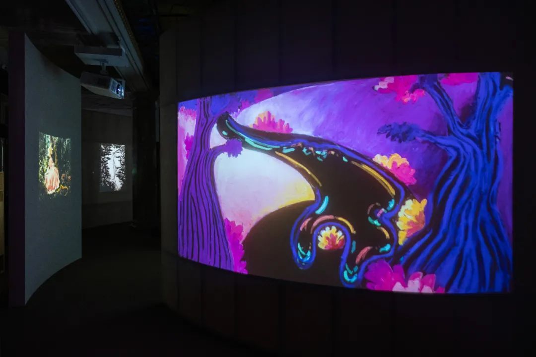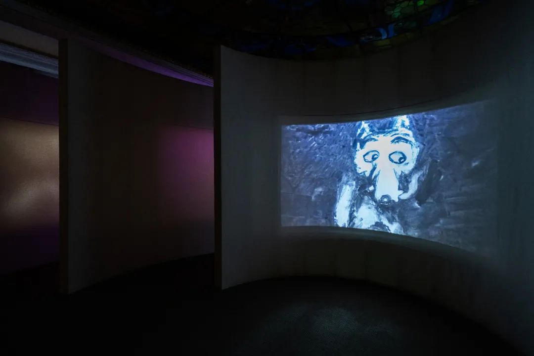 围绕着这些弧型的投影壁,依次走进Nathalie Djurberg和Hans Berg影像所塑造的叙事微宇宙,看到的是每件作品中童话人物、动物、后人类和怪异生物之间的相互折磨的戏剧,而Hans Berg在每部影像中的配乐在这个洋葱迷宫中低声交织,如同女妖塞壬的歌声,将你带向某一个地方——在这里,每个人都是加害者和受害者,争相代表着邪恶与正义,正因为这样,身负多重角色,所以求告无门,没有审判的上帝。