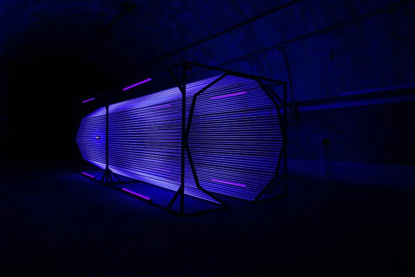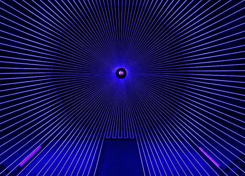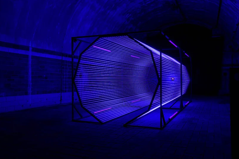 “Black Widow”唤起了技术陷阱的想法。由固定在中心点的编织羊毛纱线组成的网状结构是指久坐蜘蛛的管状网的恒定几何结构。霓虹灯被放置在形成画布框架的每个边缘。一个发出黑光的灯泡被放置在漏斗形构图的中心,就像一只蜘蛛在它的捕捉系统中张贴在望台上。