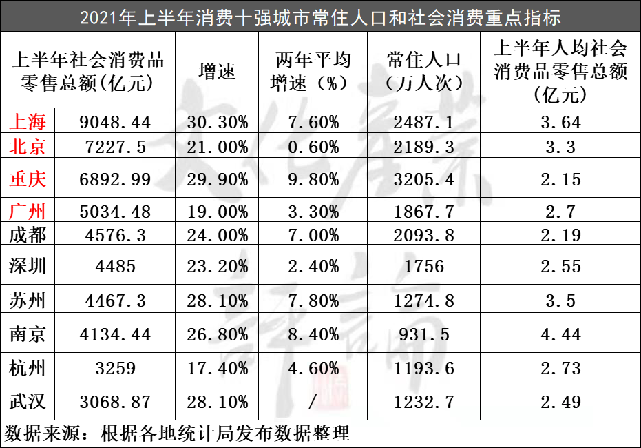从某个侧面反映出,城市常住人口和人均社会消费是非常重要的决定因素。从梳理2021年上半年全国重点城常住人口和社会消费重点指标看,5座城市均属于常住人口超过1000万的超大城市;上海、北京、重庆、广州4个国际消费中心城市社会消费品零售总额分别位居前四,天津则未能进入前十城市。