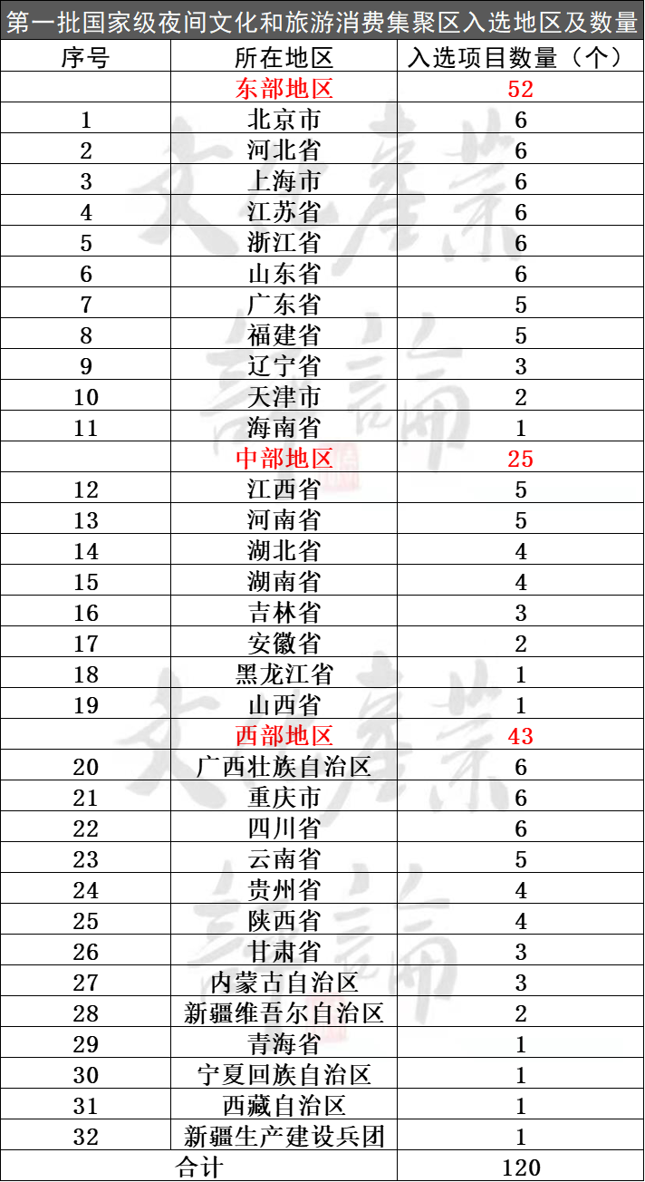 10月19日,文化和旅游部公布了首批国家级夜间文化和旅游消费集聚区名单,共有31个省份和包括北京东城区前门大街、天津和平区五大道,新疆建设兵团等在内的120个项目入选。从首批名单区域分布及数量来看,具有鲜明的区域差异性和内在的必然性。