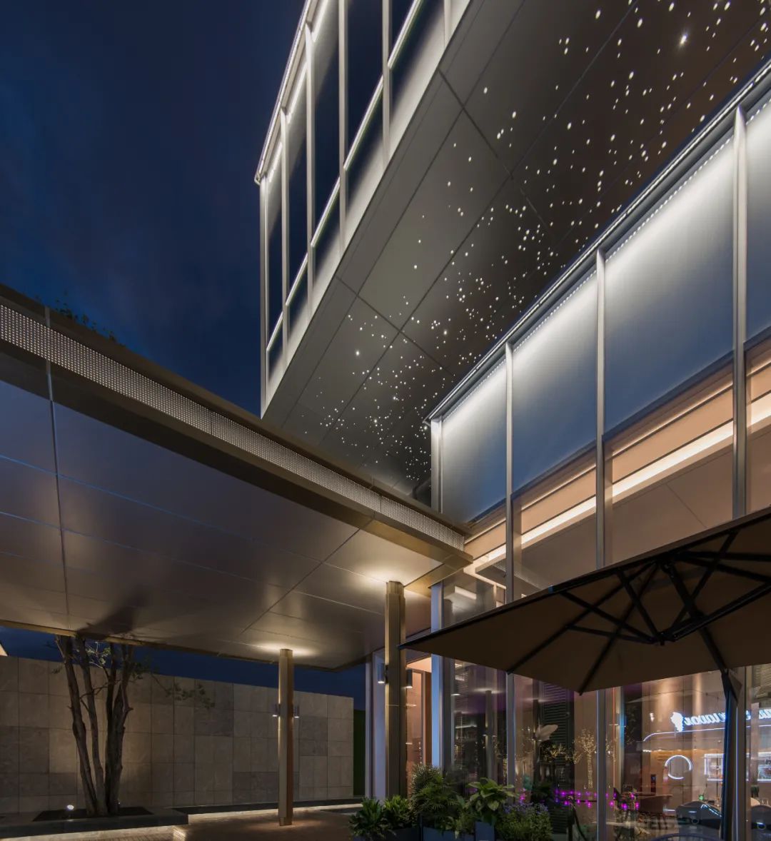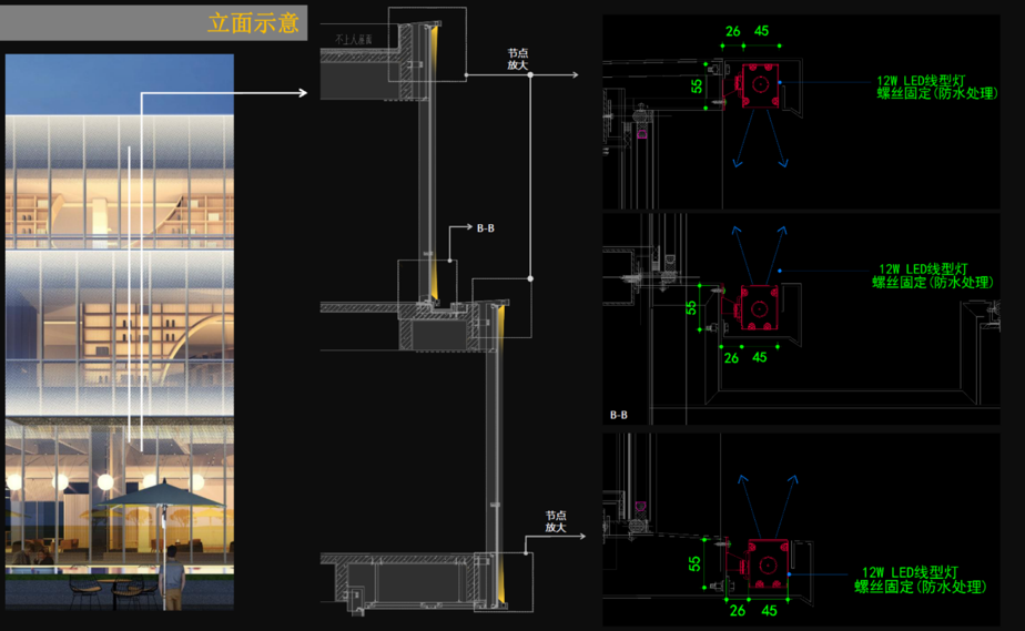 灯光设计中,希望将灯具与玻璃结合,强调建筑体块之间的明暗关系。幕墙配合安装灯槽,再对灯具进行防眩处理,确保在平行面与垂直面都看不到灯珠。
