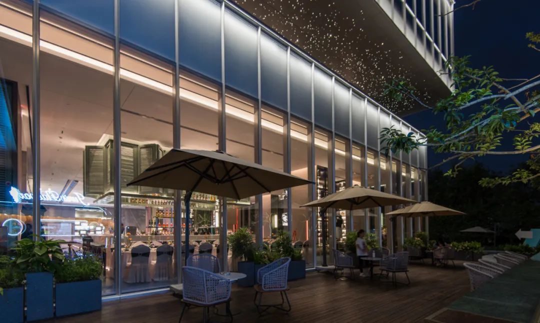 坐在沿河的休憩平台,吹着微风,看着点点的星光,欣赏着灯光刻画的建筑形体、感受不一样的夜晚……